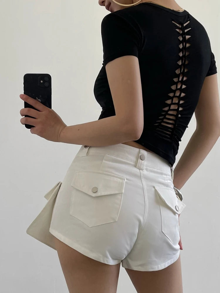 Person wearing a gray t-shirt with cut-out design on the back, standing against a plain background.