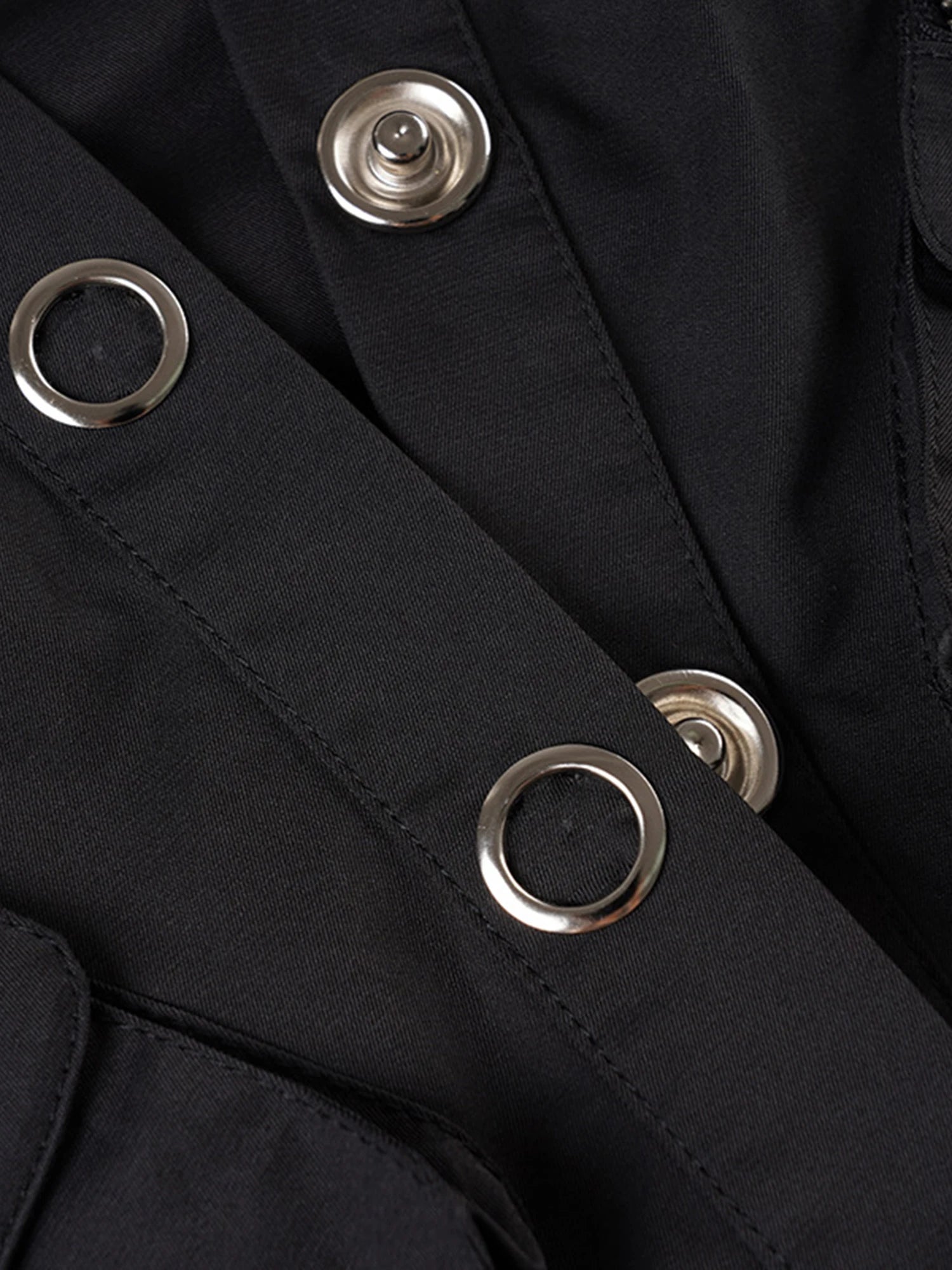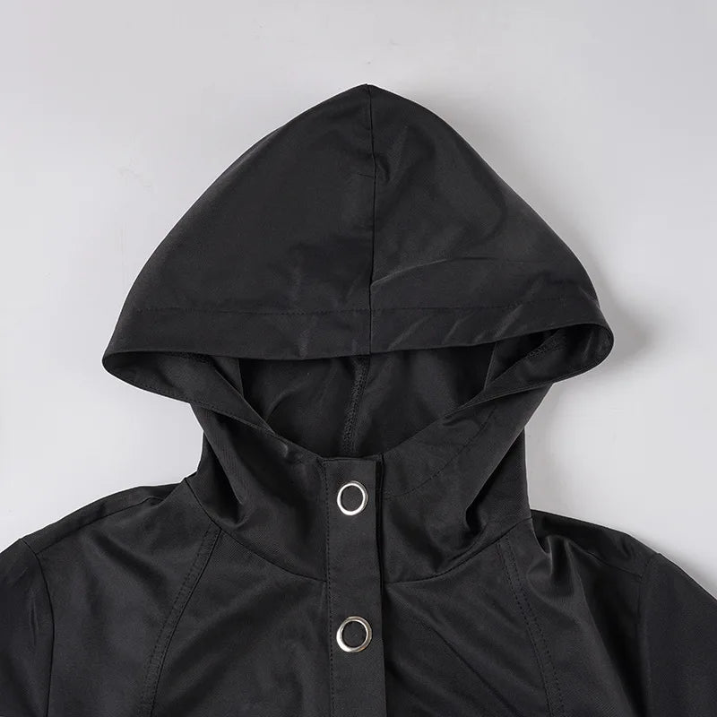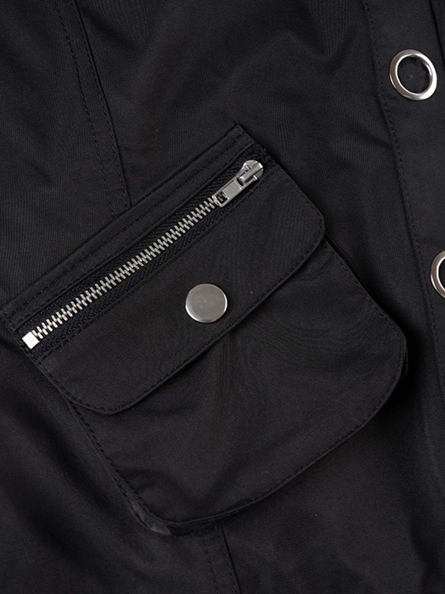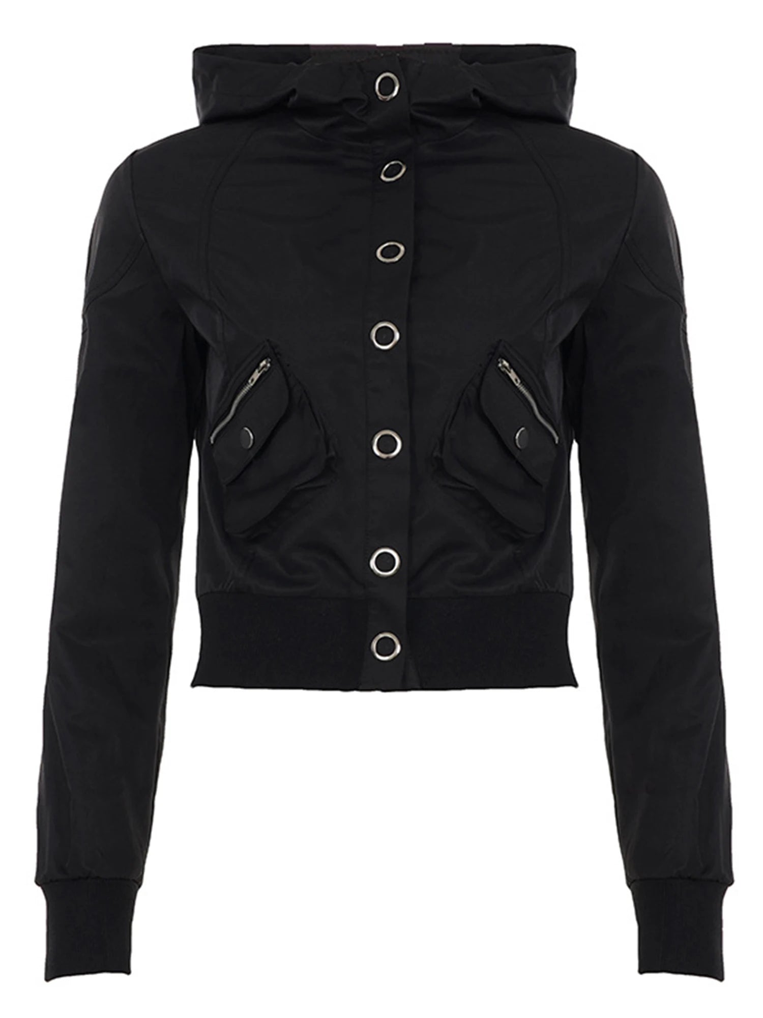 Black Hooded Cargo Snap Button Jacket with Pockets