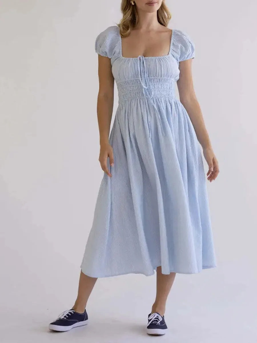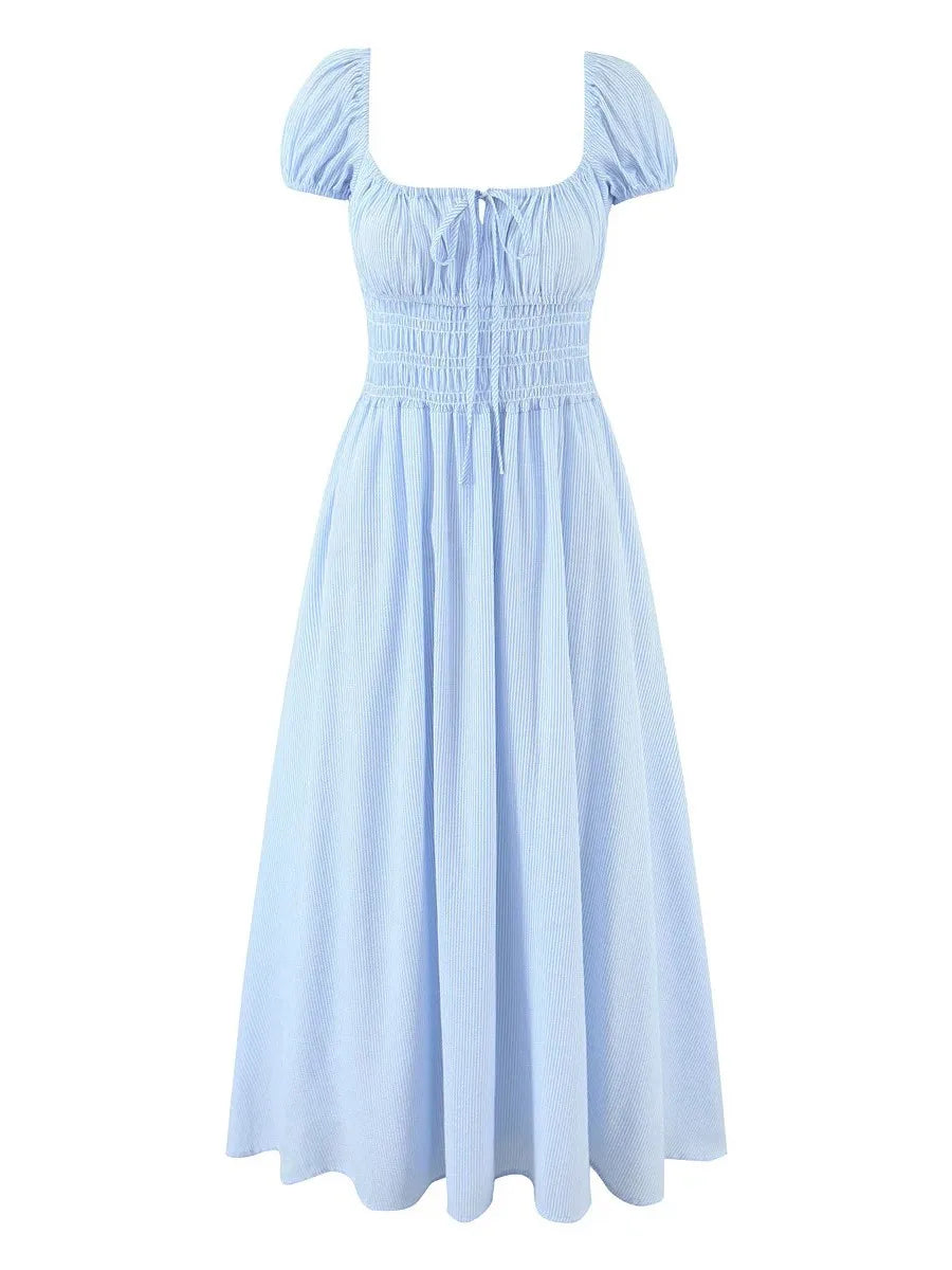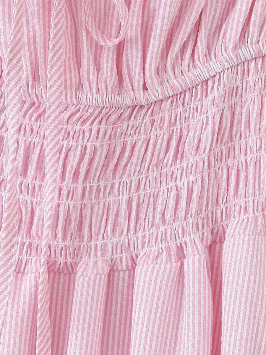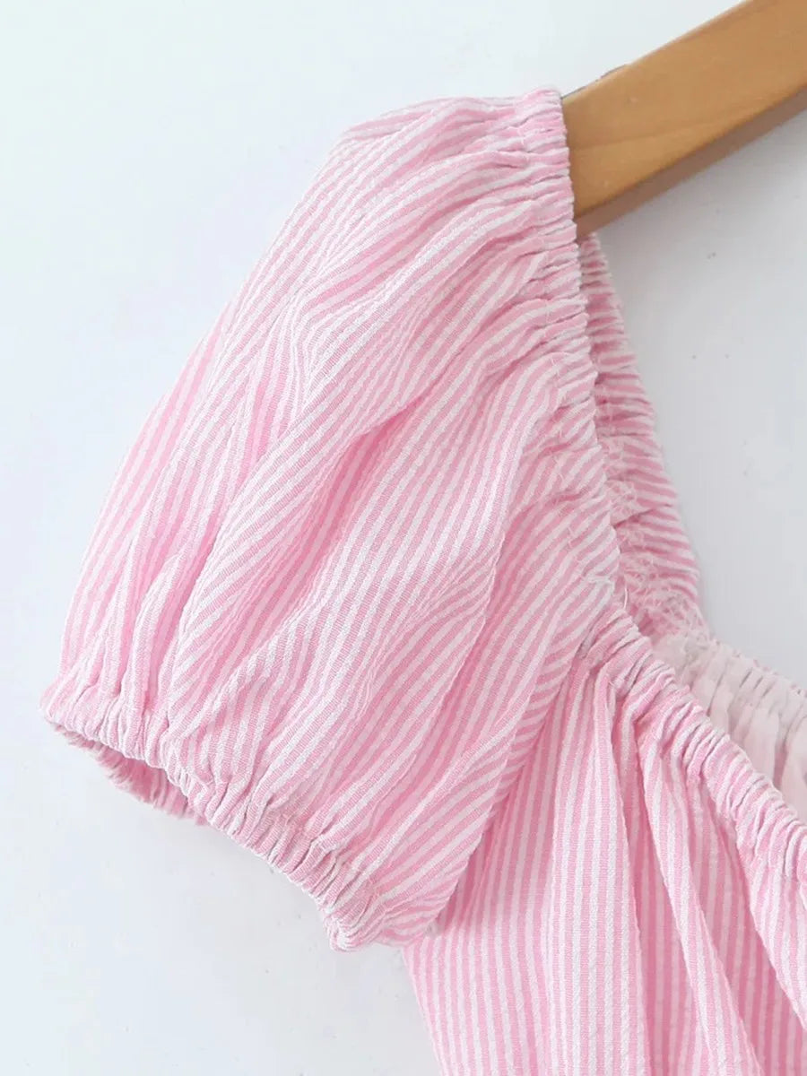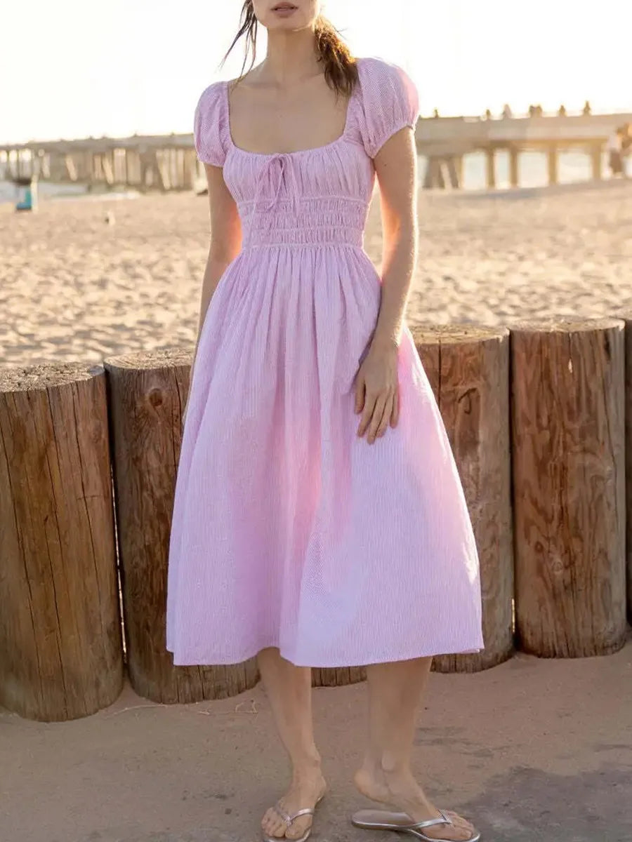 Striped Short Sleeve Ruched Bow Midi Dress