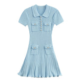 Polo Knitted Short Sleeve Single Breasted Flower Button Mini Dress