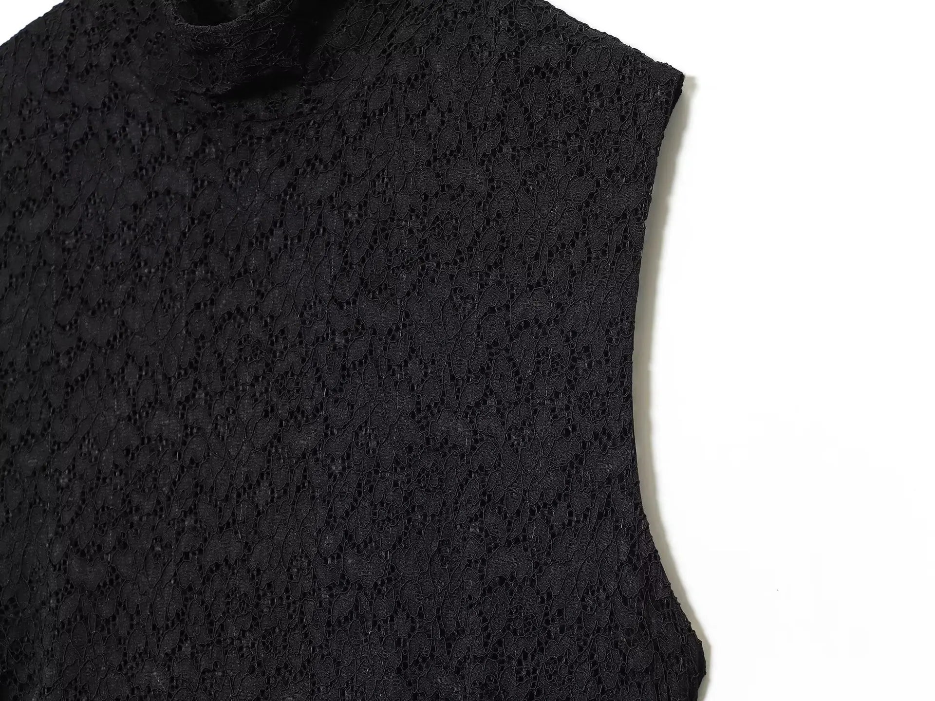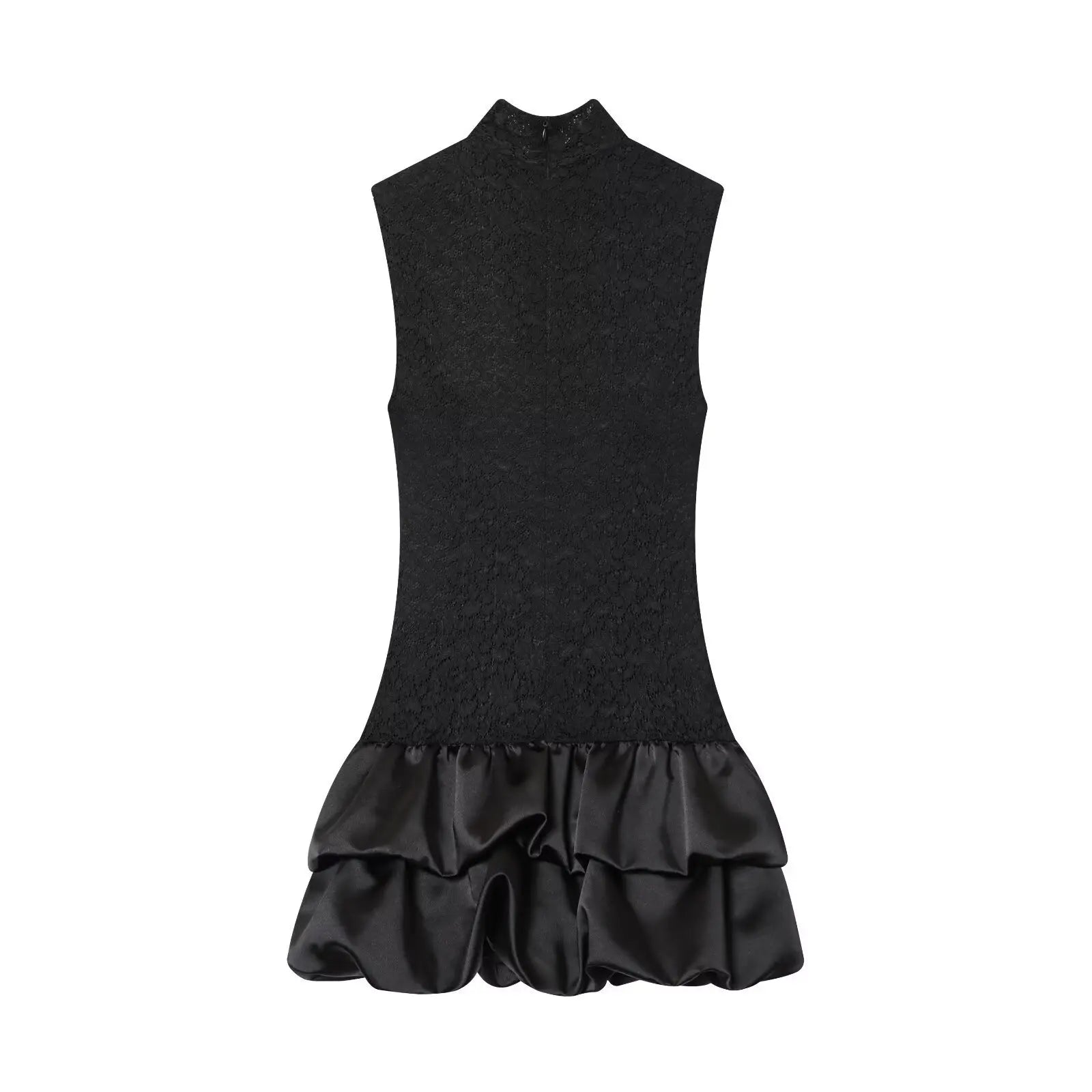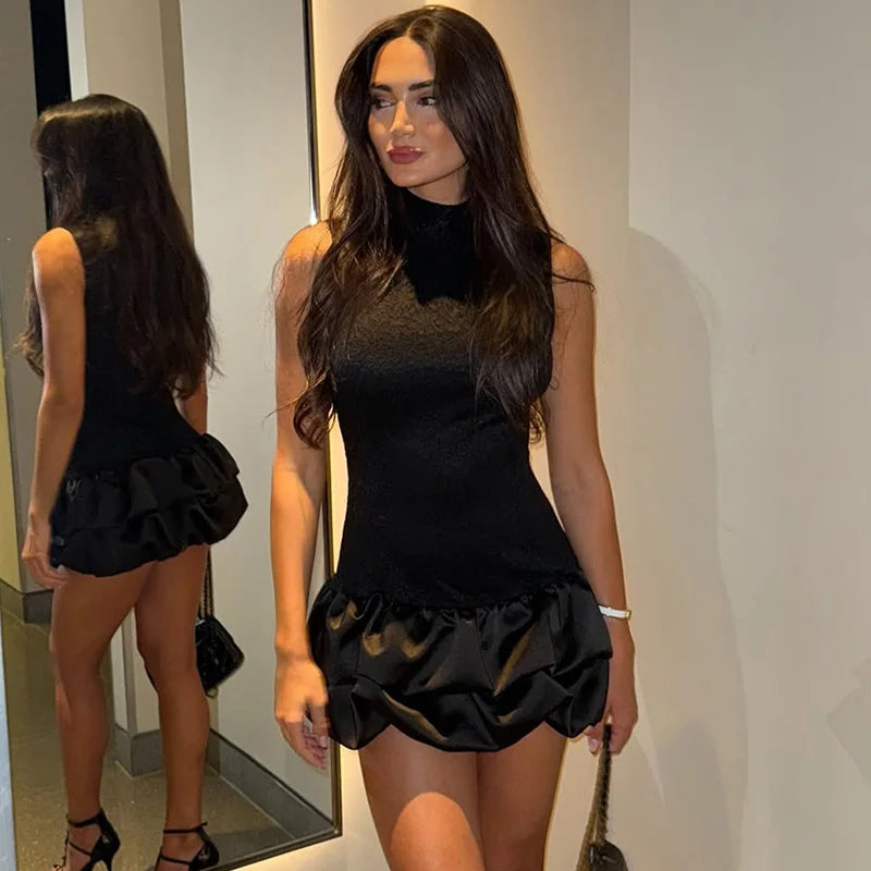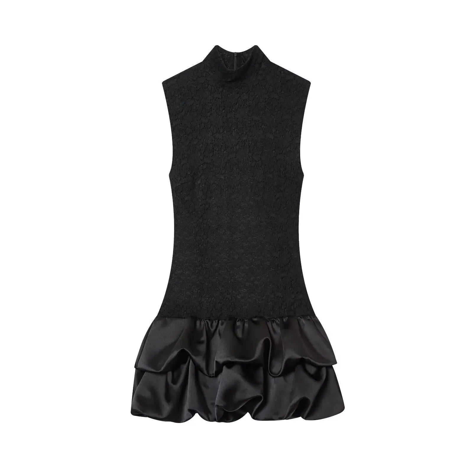 Black Lace High Neck Sleeveless Satin Puff Hem Mini Dress