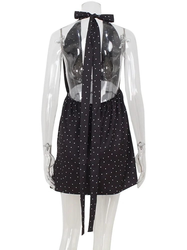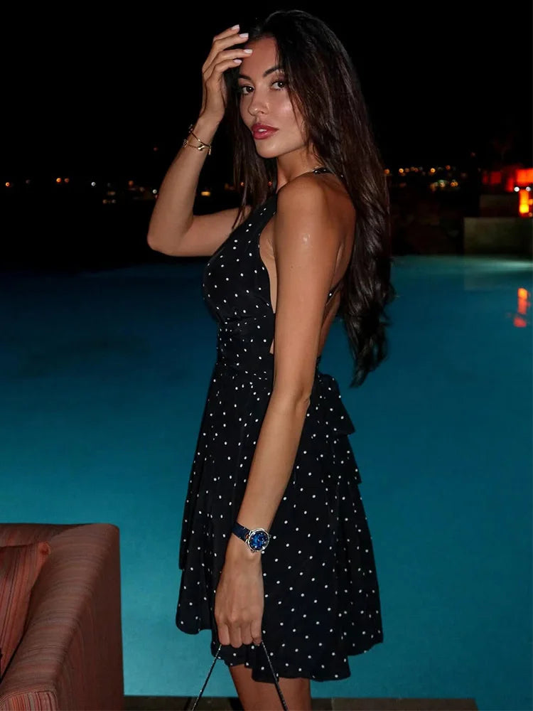 Step out in playful elegance with our Black Polka Dot V-Neck Sleeveless Mini Dress, a charming choice for any adult wardrobe. This eye-catching dress features a classic polka dot pattern on a sleek black background, offering a timeless yet fun aesthetic. The flattering V-neckline and an alluring backless decoration add a touch of sophistication, perfect for warmer days.