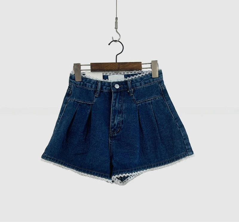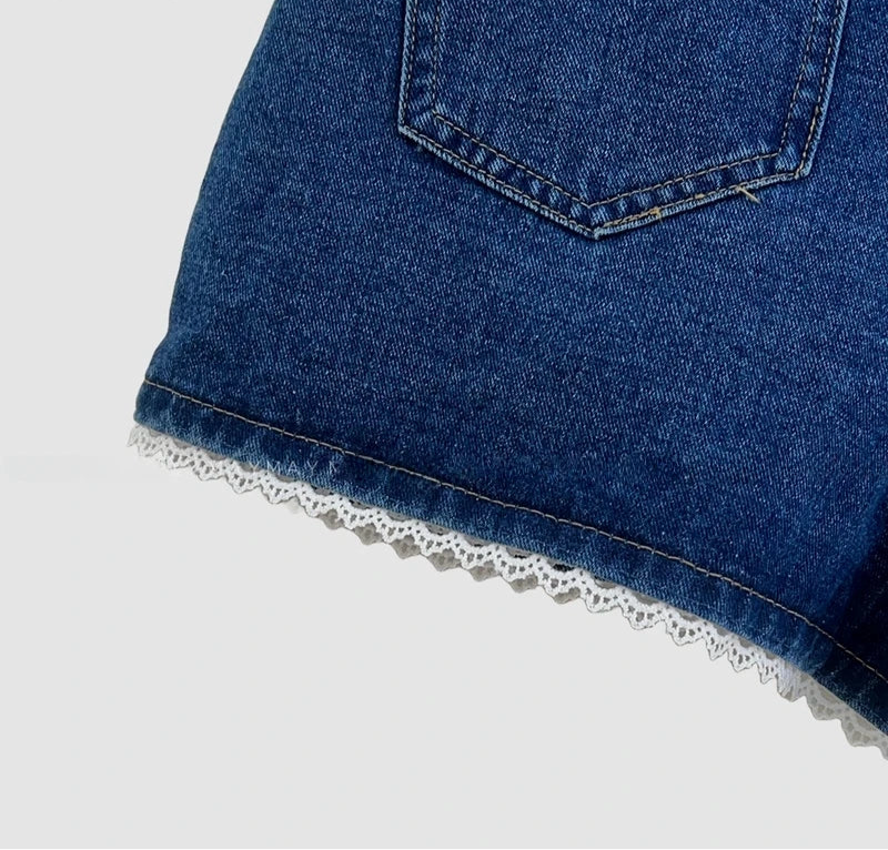 Product Description: Elevate your casual style with our Lace Trim High Waist Denim Shorts, a charming addition for any adult wardrobe. These trendy shorts feature a flattering high waist and a comfortable loose fit, perfect for warm weather. Delicate lace decoration along the trim adds a touch of feminine elegance to the classic denim fabric. Functional pockets and a secure zipper fly closure with button detail ensure both style and practicality.