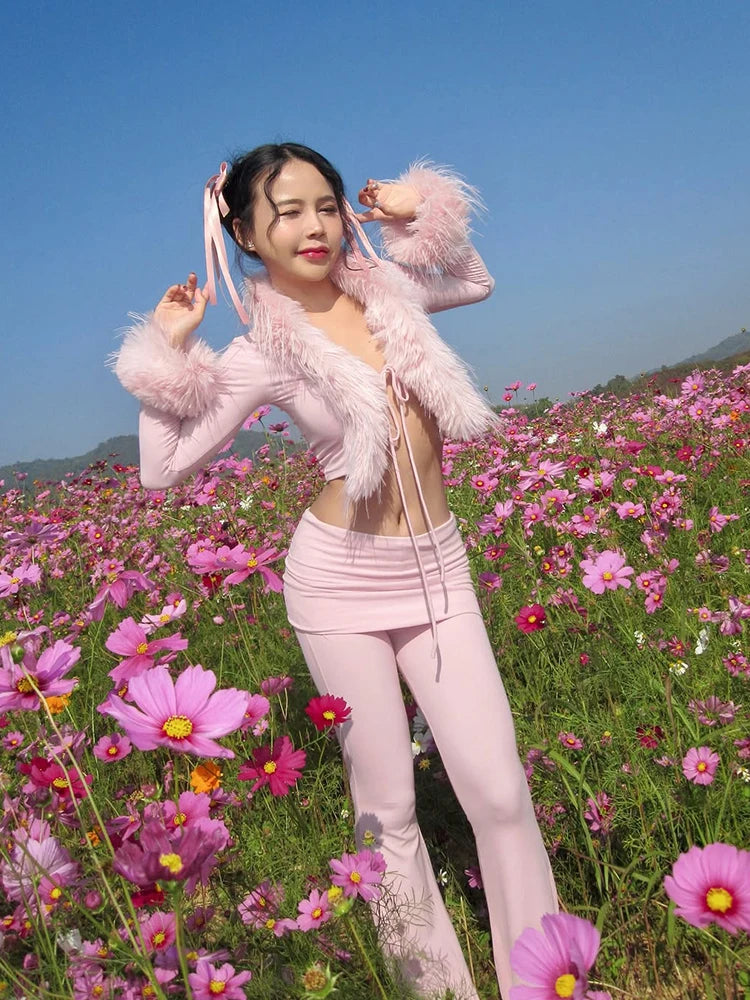 Pink Furry Lace-Up Full Sleeve Jacket And Pants Set