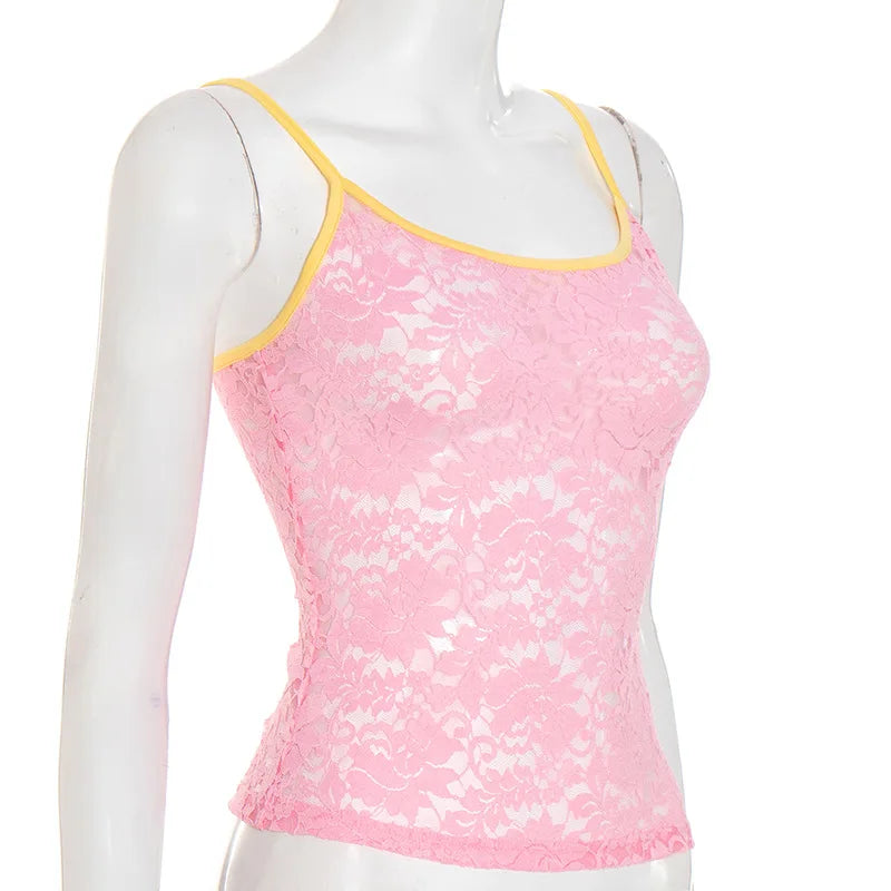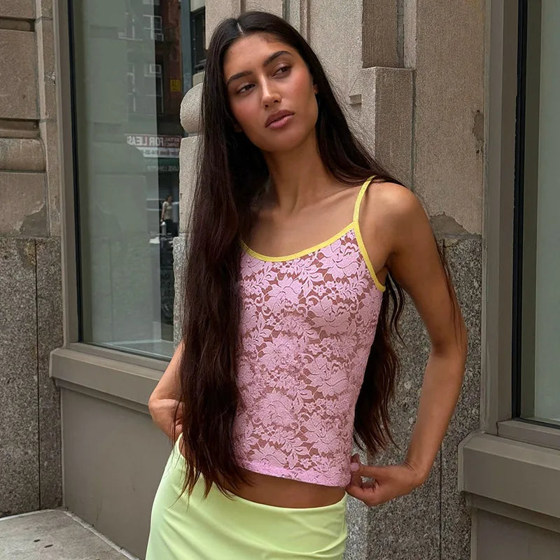 Woman wearing a pink lace tank top with yellow trim against a plain background