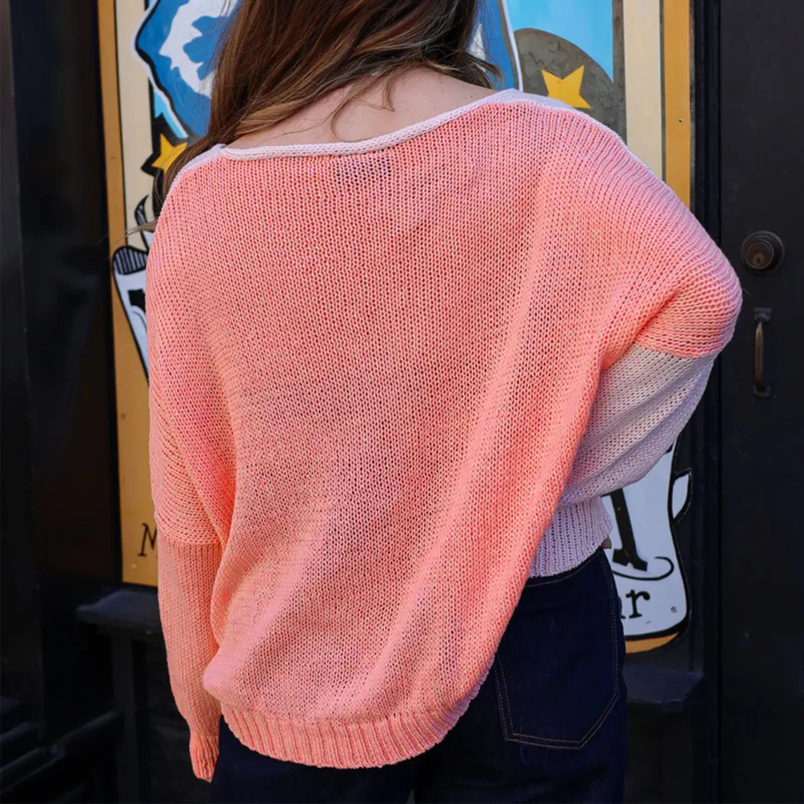 Woman wearing a pink and orange sweater with a martini glass design on a city street.