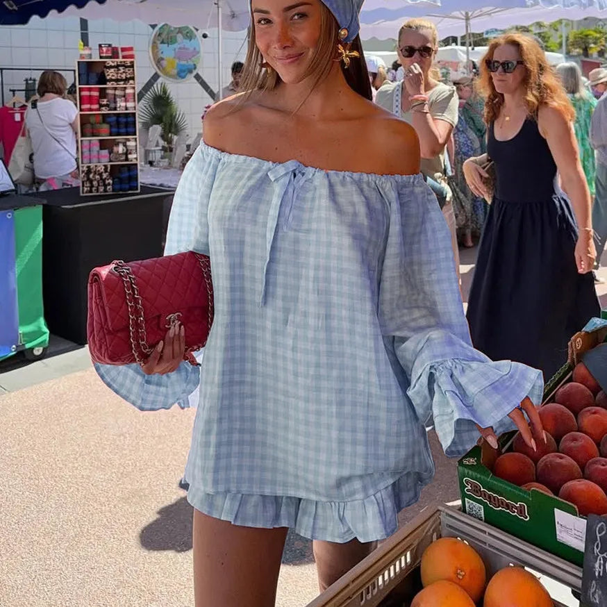Plaid Off Shoulder Long Sleeve Tops and Ruffle Shorts Set