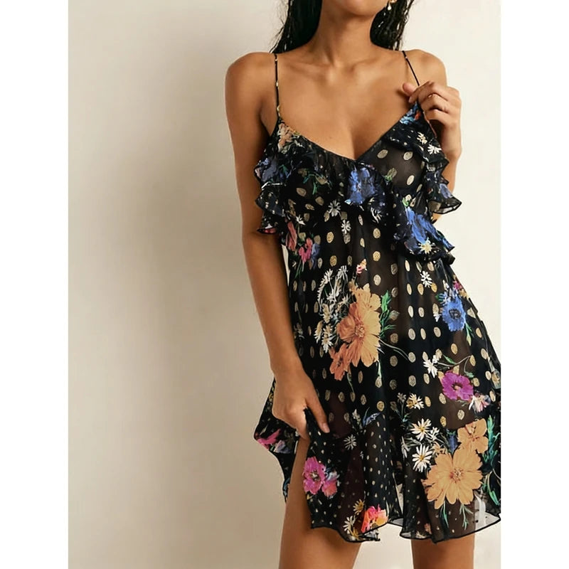 Polka Dot/Floral Sheer Ruffle Hem Mini Dress