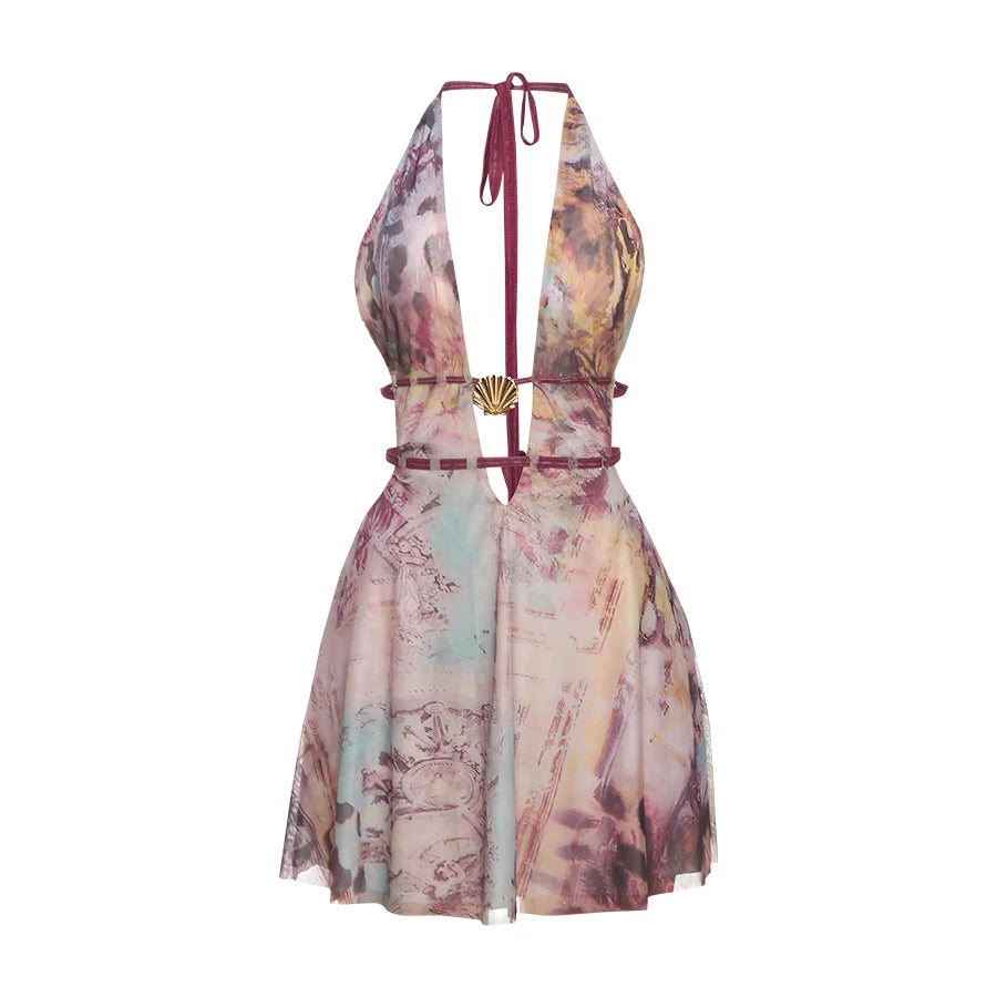 Woman in a floral dress with a red handbag standing on a stone wall by the sea.