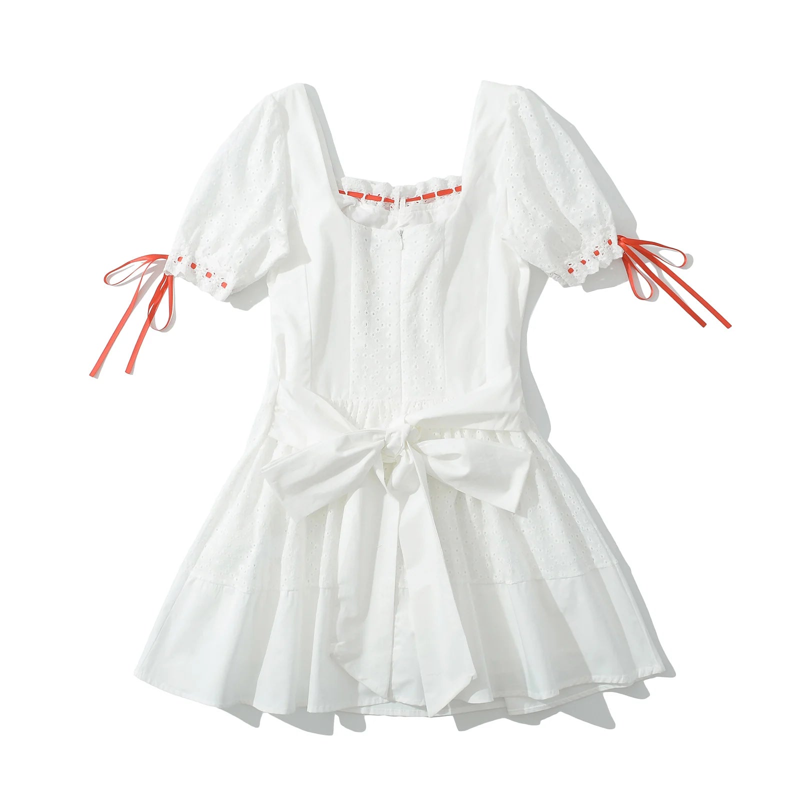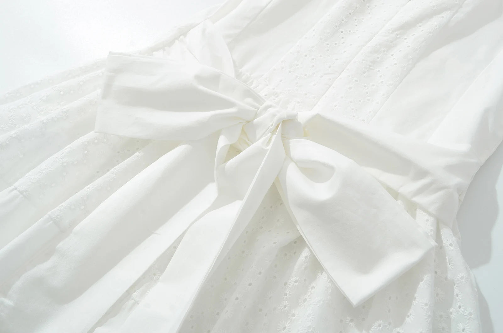 Woman in a white dress standing in a bedroom with wooden furniture and floral patterns- back view