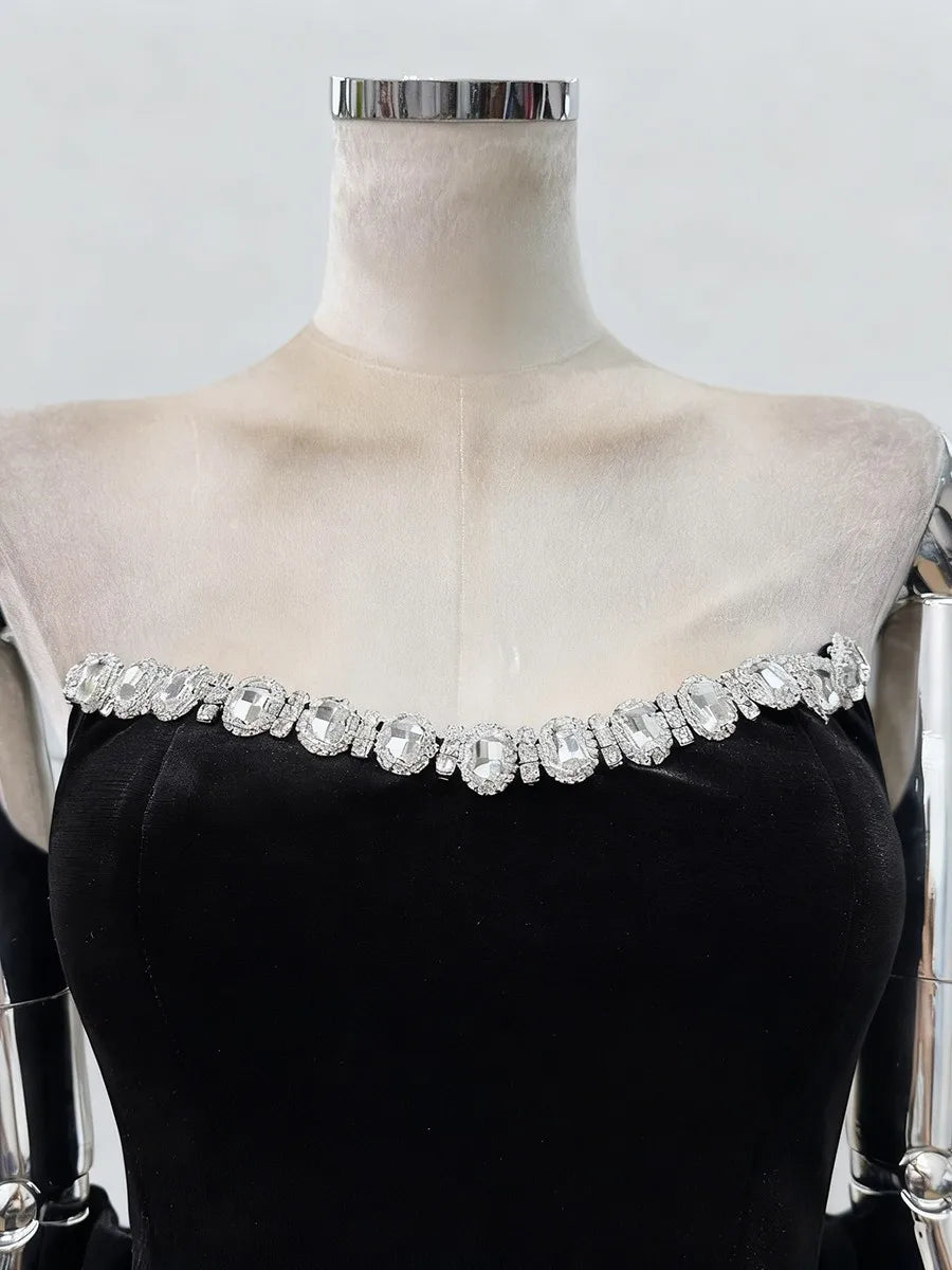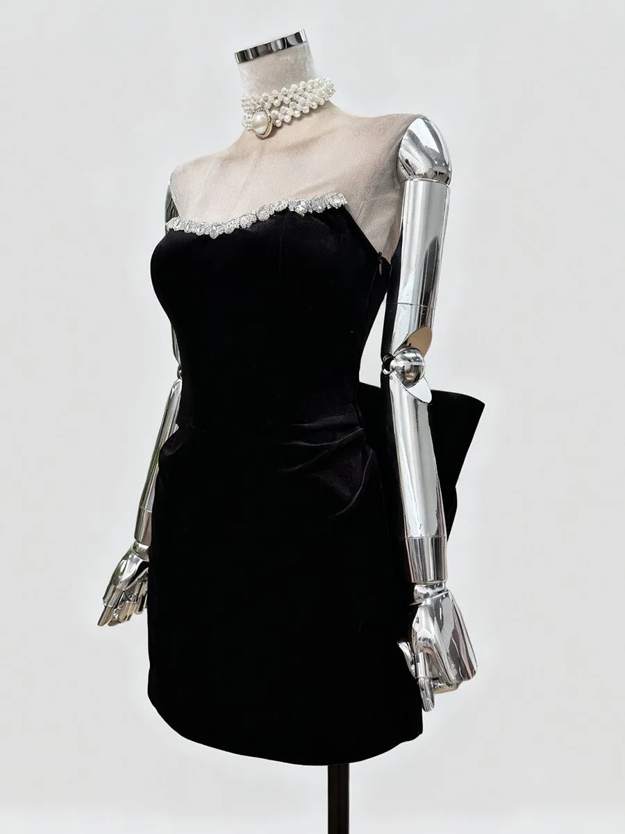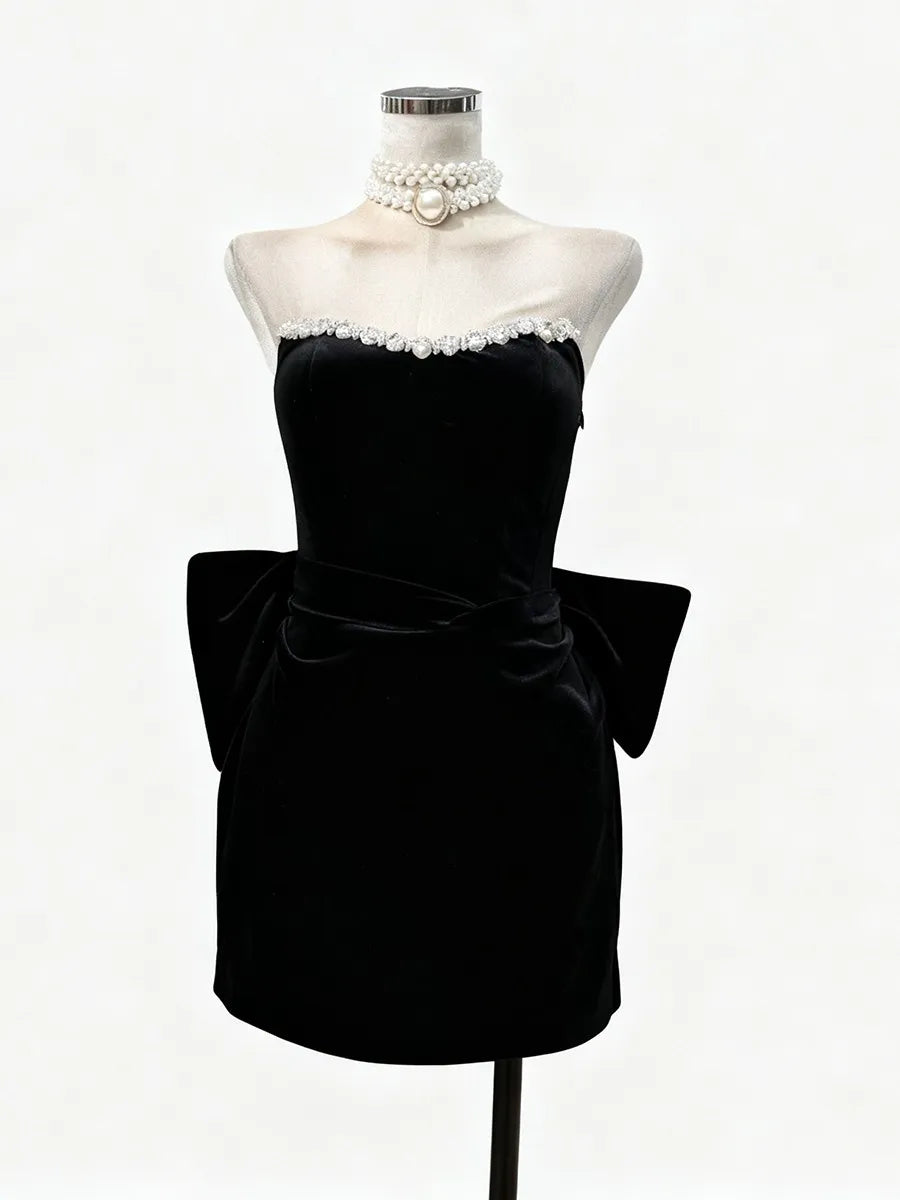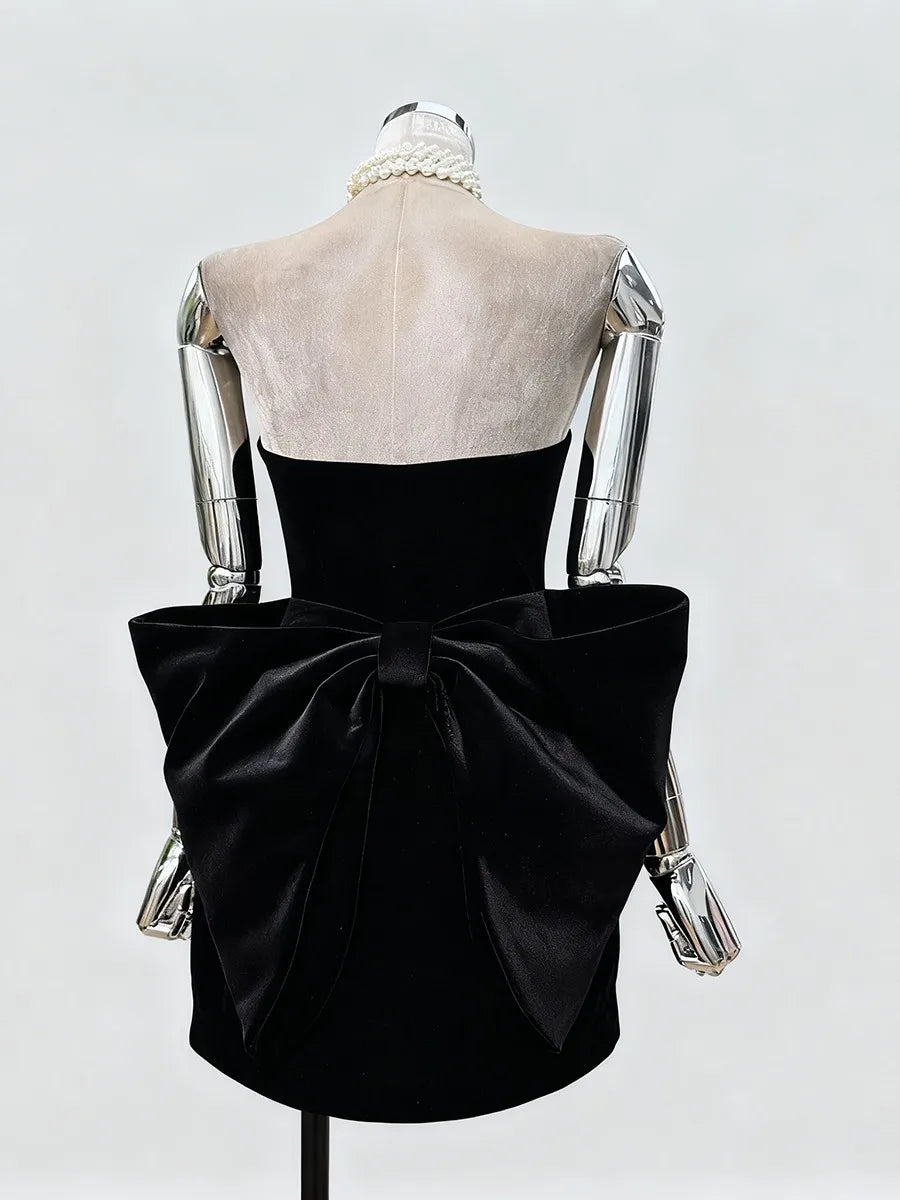 Black Diamonds Trim Velvet Strapless Bowknot Mini Dress