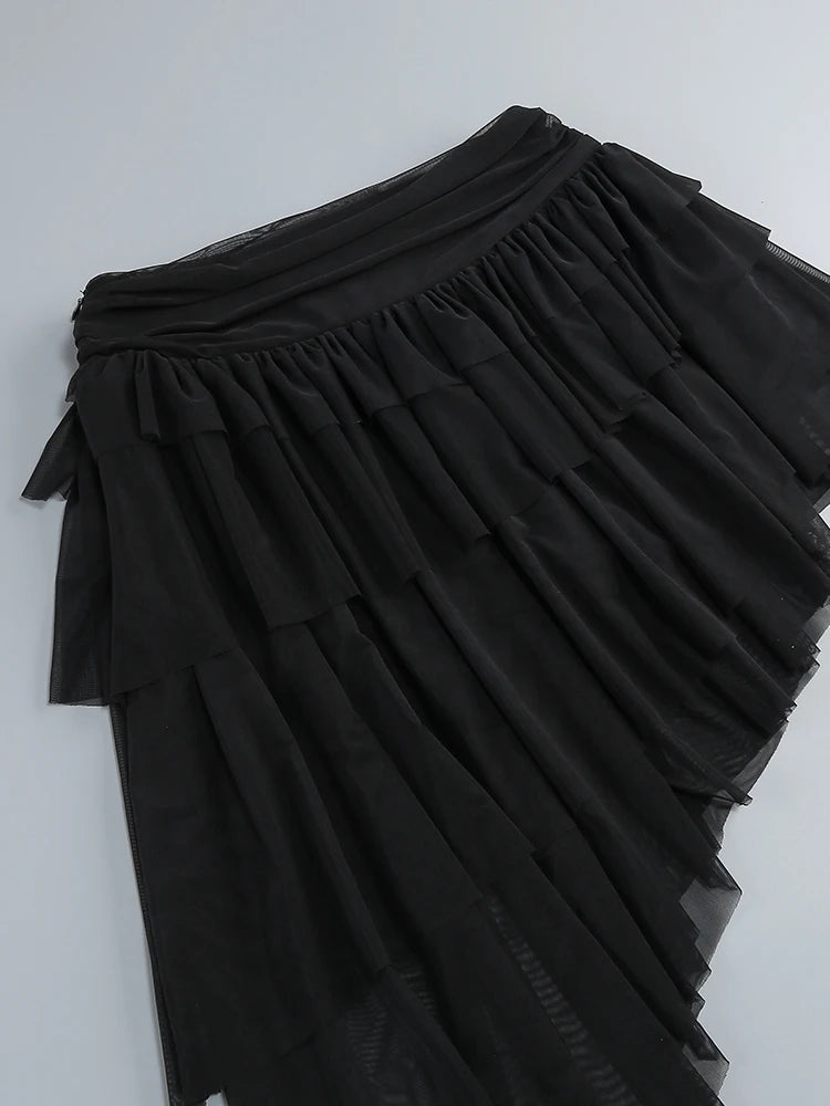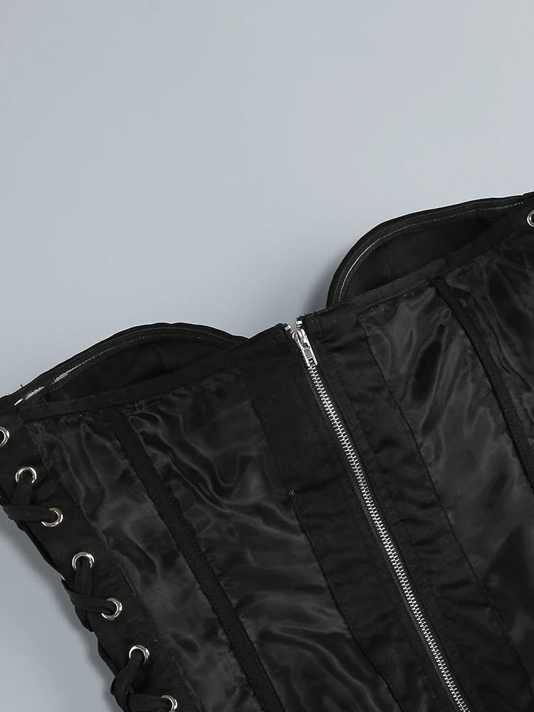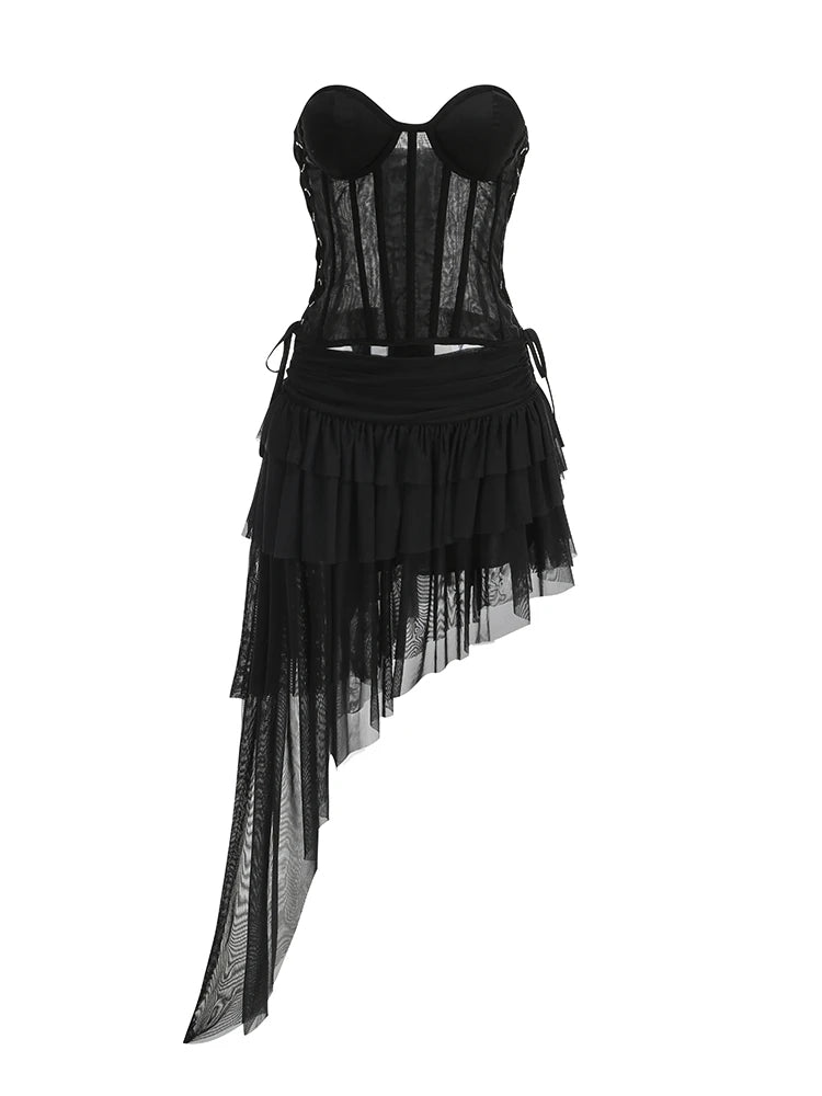 Black Lace-up Corset Top And Ruffles Split Long Skirt Set