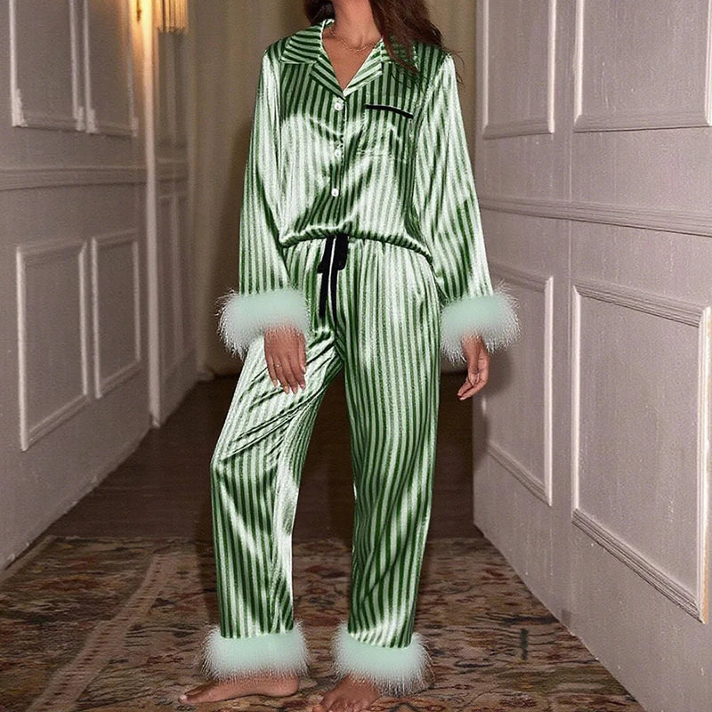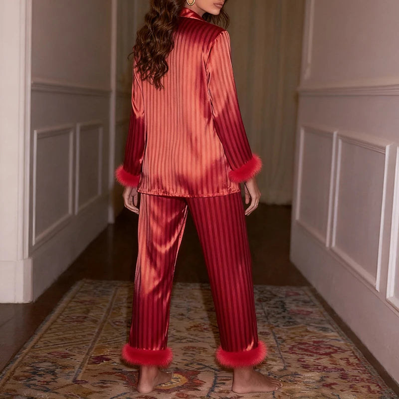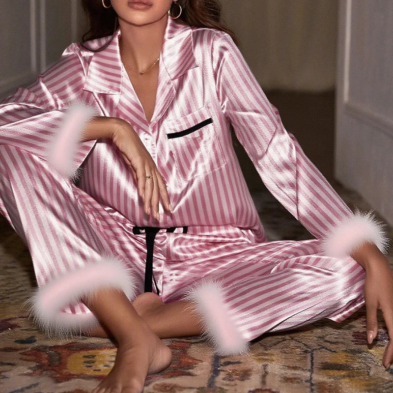 Feather Trim Striped Satin Long Sleeve Shirt And Pants Sleepwear Set