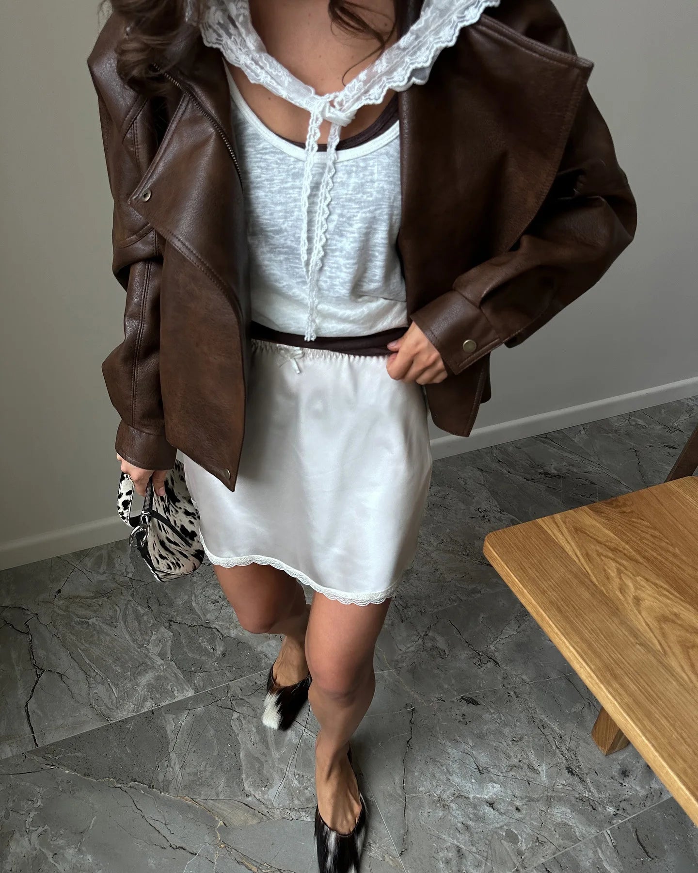 Add a touch of playful sophistication to your wardrobe with our Satin Bow Lace Mini Skirt. This eye-catching skirt, designed for any adult, features a luxurious simulated silk fabric with a delicate satin finish, complemented by charming lace decoration and a sweet bow accent (implied by title, lace is explicit in spec). Its sleek straight silhouette and above-knee mini length are perfect for making a stylish statement.