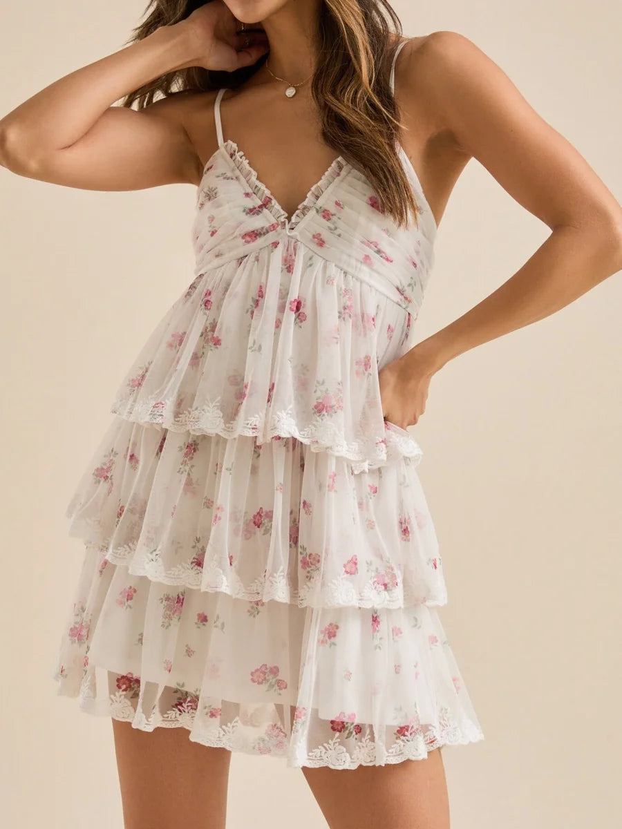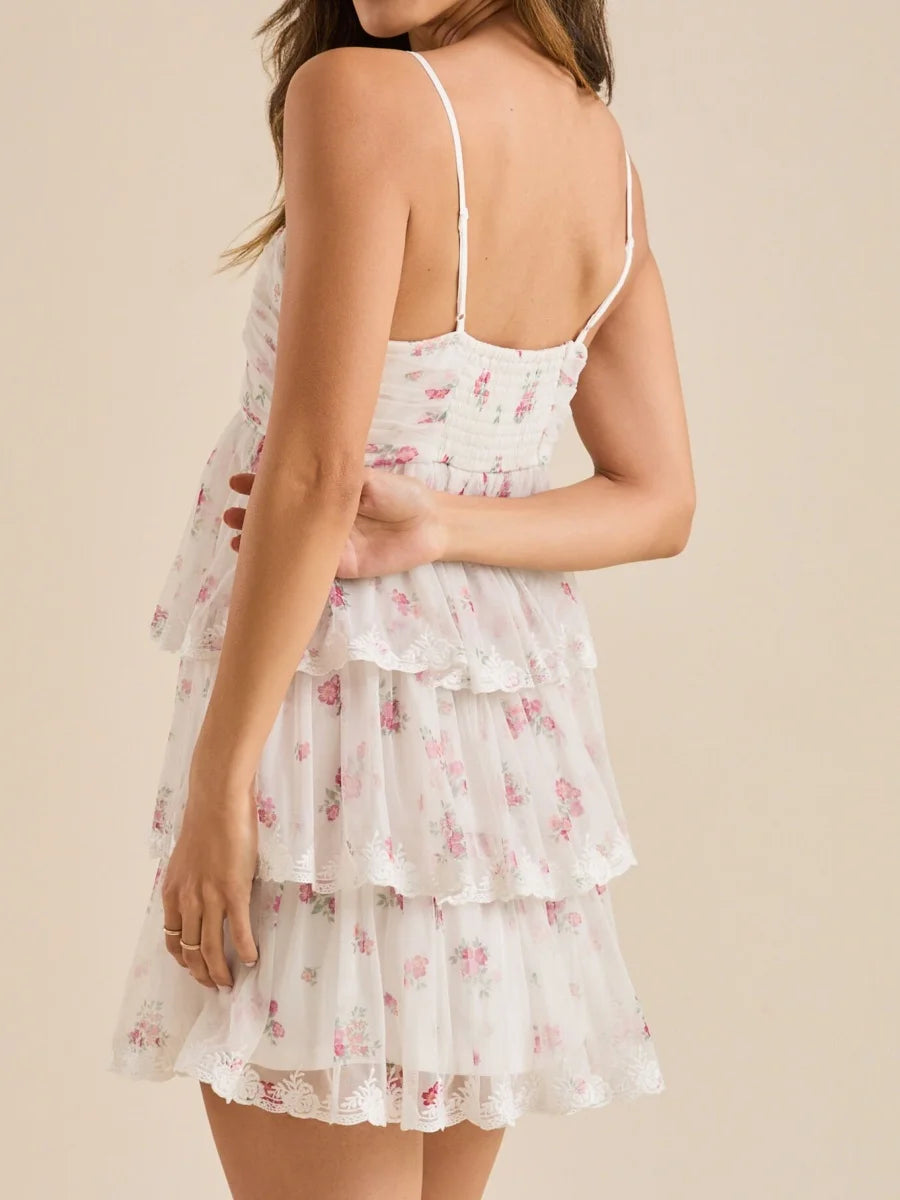 Tiered Ruffle Floral Print Spaghetti Strap Short Dress