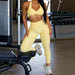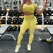 Woman in a yellow athletic outfit taking a mirror selfie in a gym.