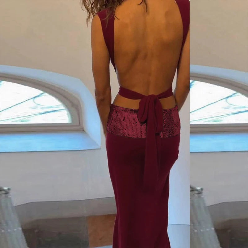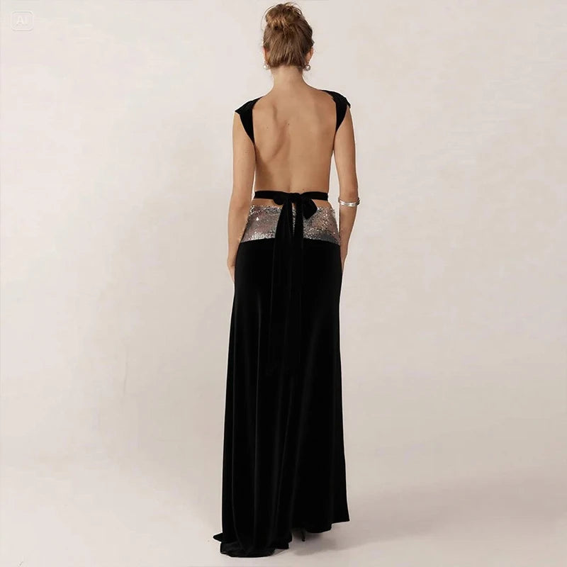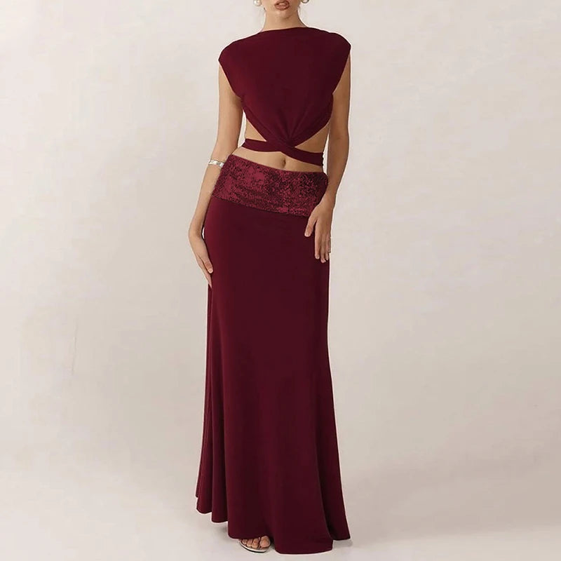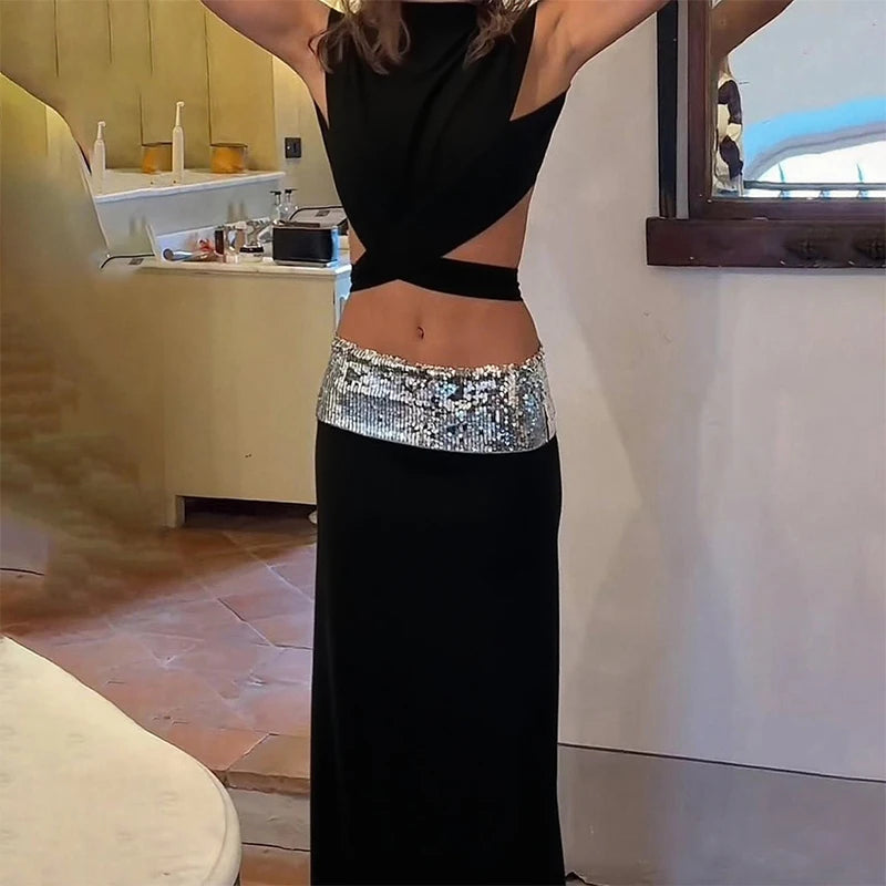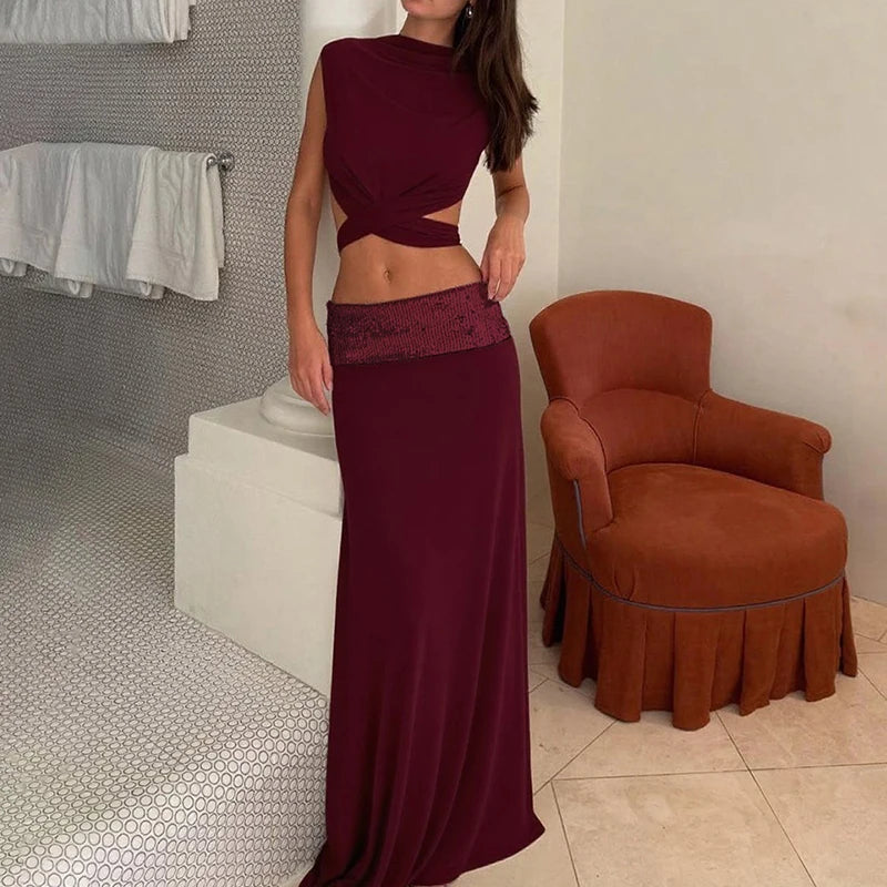 Bandage Tie Up Crop Top & Sequin Strap Long Skirt Set