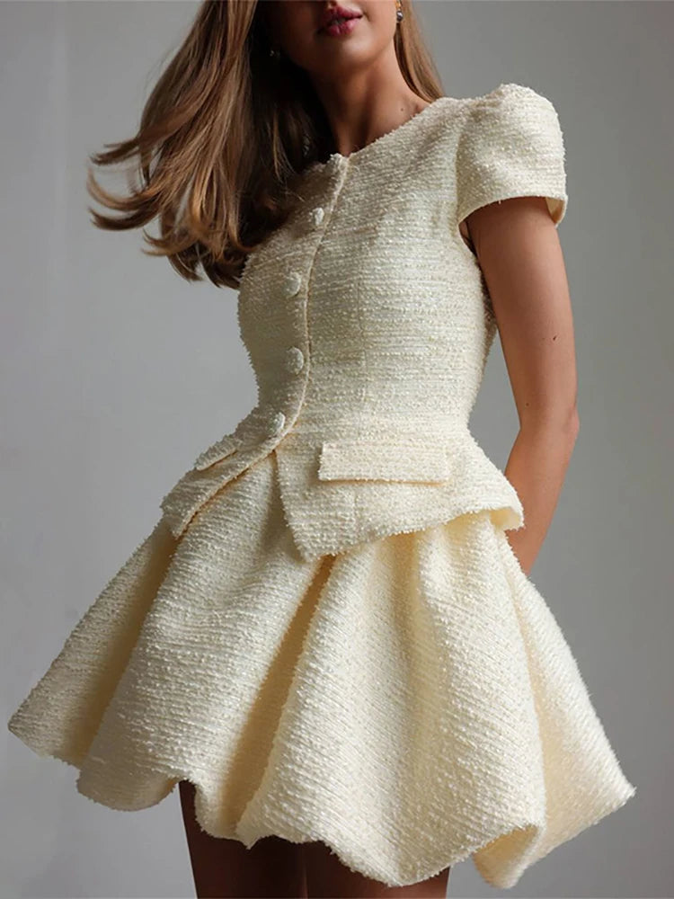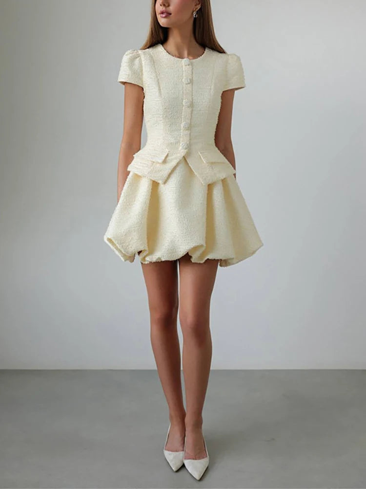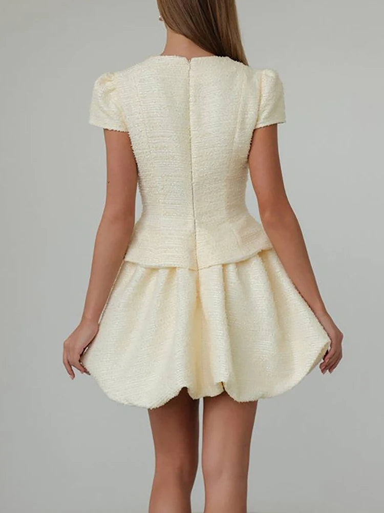 Beige Tweed Short Sleeve Top And Puff Mini Skirt Set