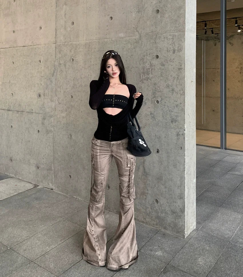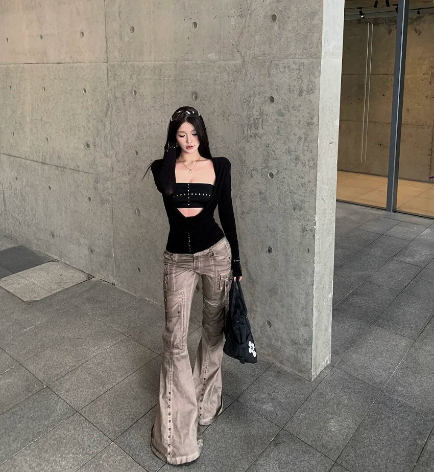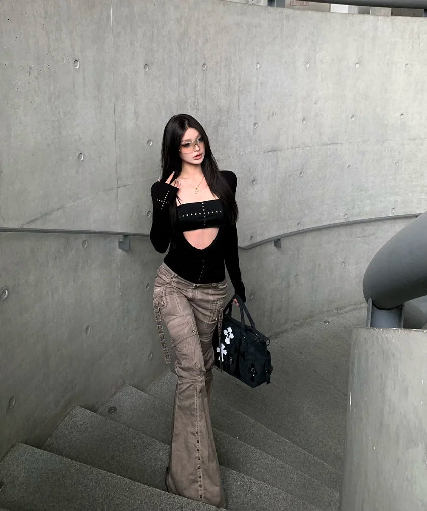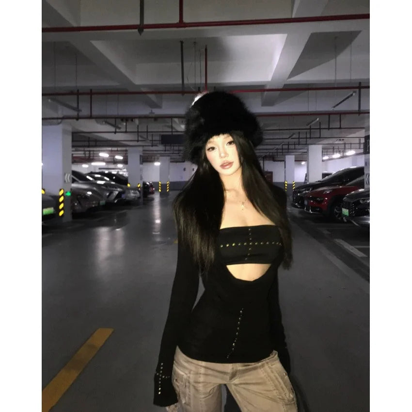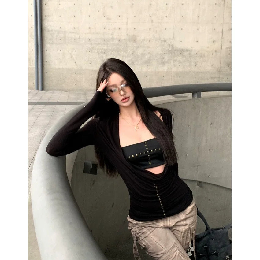 Make a bold Y2K statement with our Black Long Sleeve Cut Out Drape Halter Top, a daring addition for any adult wardrobe. This eye-catching top features a unique asymmetrical collar that transitions into a stylish halter neck, showcasing modern design. Daring cut-out details and an elegant draped silhouette add an alluring touch, while subtle rivet decoration provides an edgy accent.