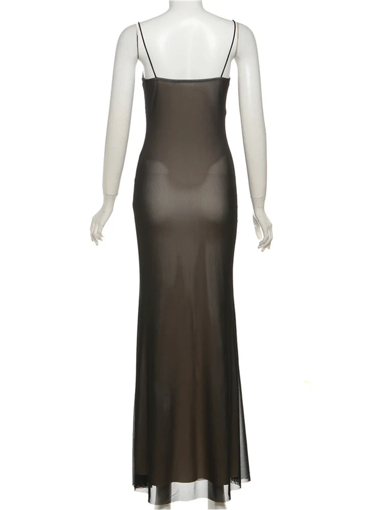 Black Pu Leather Patchwork Layered Mesh Maxi Dress