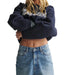 Navy sweatshirt with lace detail worn by a person on a plain background