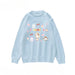 Person wearing a light blue sweater with cartoon designs, sitting in a vehicle.
