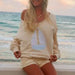 Woman wearing a light blue off-shoulder sweater with a sailboat design by the beach.