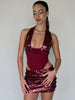 Burgundy Sequin Patchwork Halter Bodysuit And Mini Skirt Set