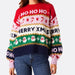 Person wearing a colorful Christmas-themed sweater with 'HO HO HO' and 'Merry Xmas' text.