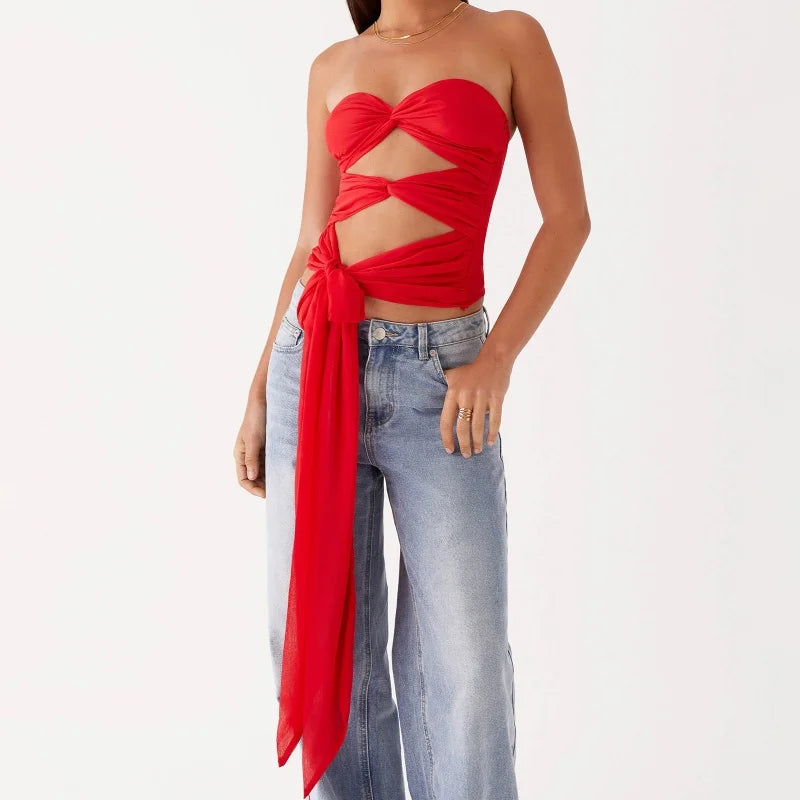 Embrace a bold Summer look with our Edgy Strapless Cutout Crop Top, a contemporary statement piece for women. This striking bandeau top features a unique design with strategic cutouts across the front, creating a visually dynamic and alluring silhouette. The strapless neckline leads to a distinctive twisted knot detail at the center, and long fabric ends extend to be tied at the waist or hips, offering an adjustable and personalized fit. In a sleek solid black, this crop top exudes modern style and is perfect for making a confident fashion statement at parties, events, or warm-weather outings for any woman.