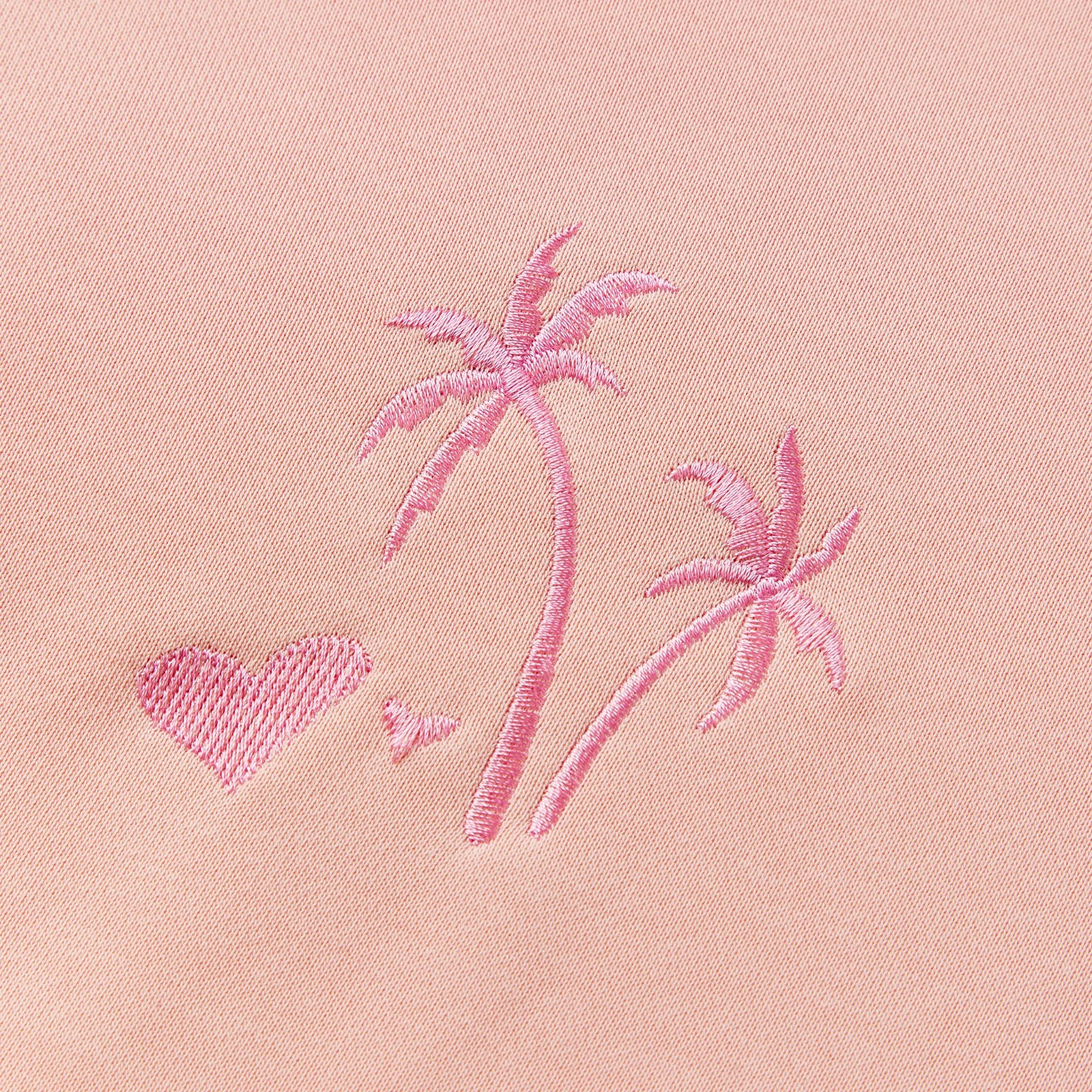 Person wearing a pink hoodie with palm tree design and light blue jeans