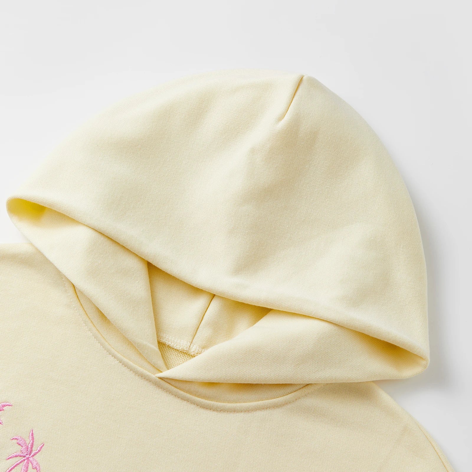 Yellow hoodie with pink graphic of a car and palm trees on a car seat.