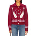 Red sweater with shark design worn by a person