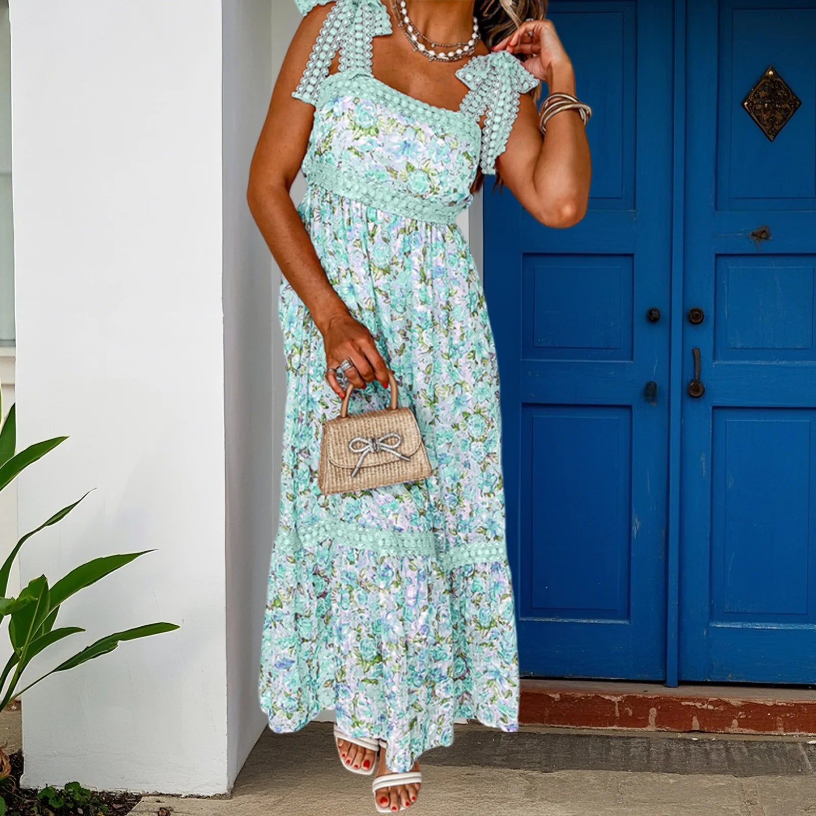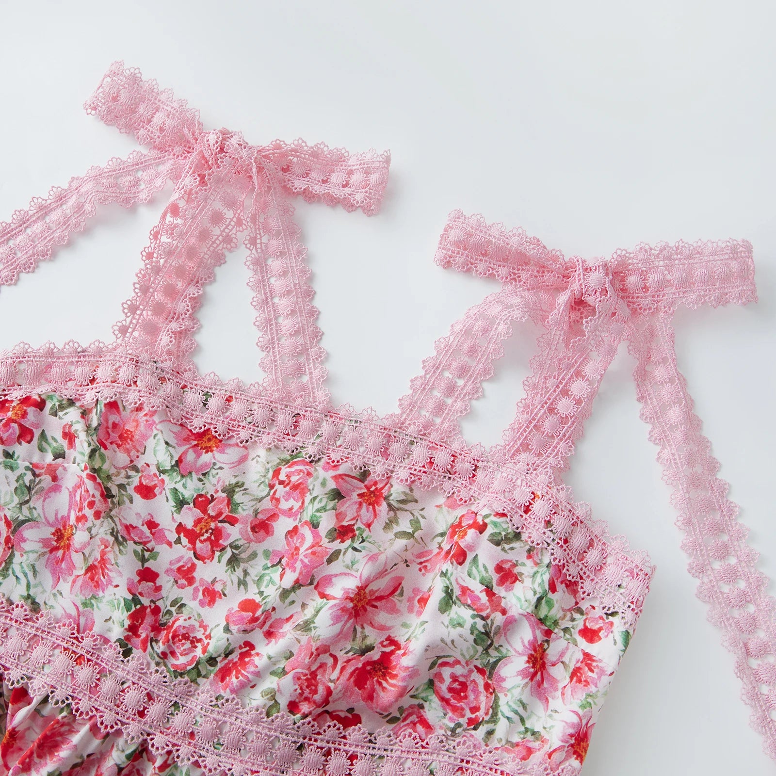 Woman wearing a pink floral dress standing in front of green plants- front view