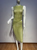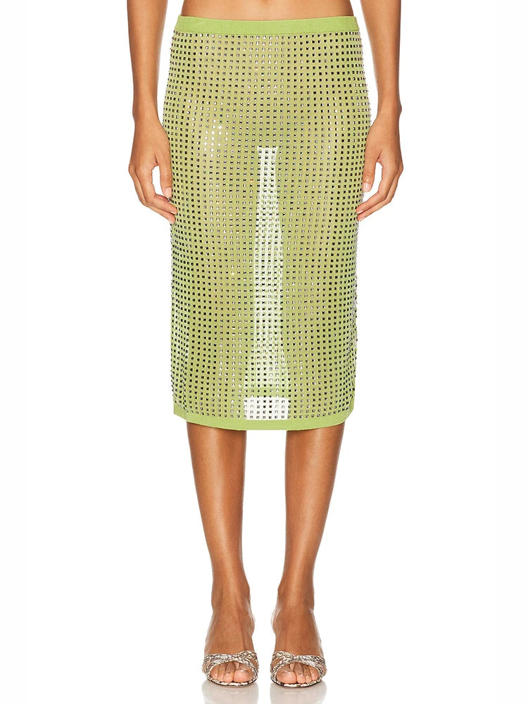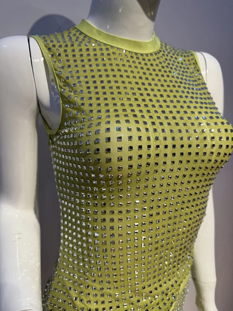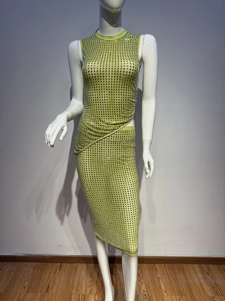 Green O Neck Sleeveless Crystal Top And Mesh Midi Skirt Set