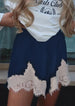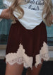 Person wearing pink satin shorts with lace trim sitting on a chair.