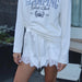 Person wearing a white long-sleeve top with 'Glamping Girls Club' text and a white lace skirt.