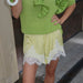 Person wearing a white lace-trimmed skirt over a white t-shirt with text.