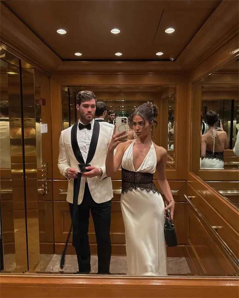 Lace Patchwork Halter Satin Maxi Dress