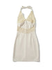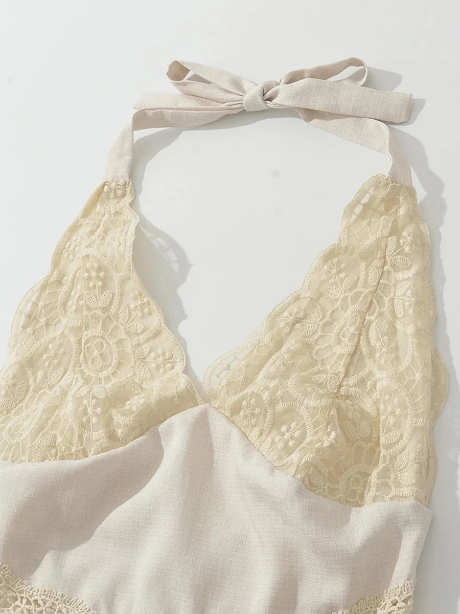 Woman in a beige dress with lace detailing holding a green handbag in an outdoor setting.