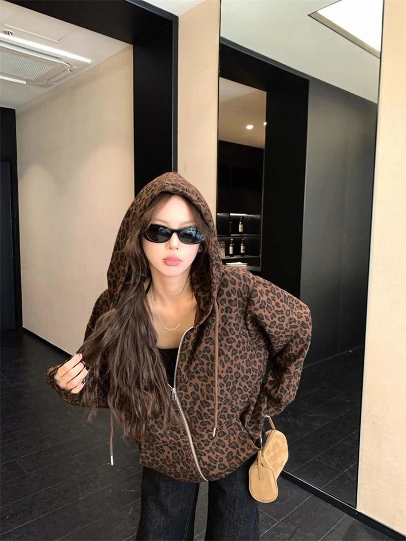Woman taking a mirror selfie wearing a leopard print jacket.