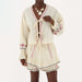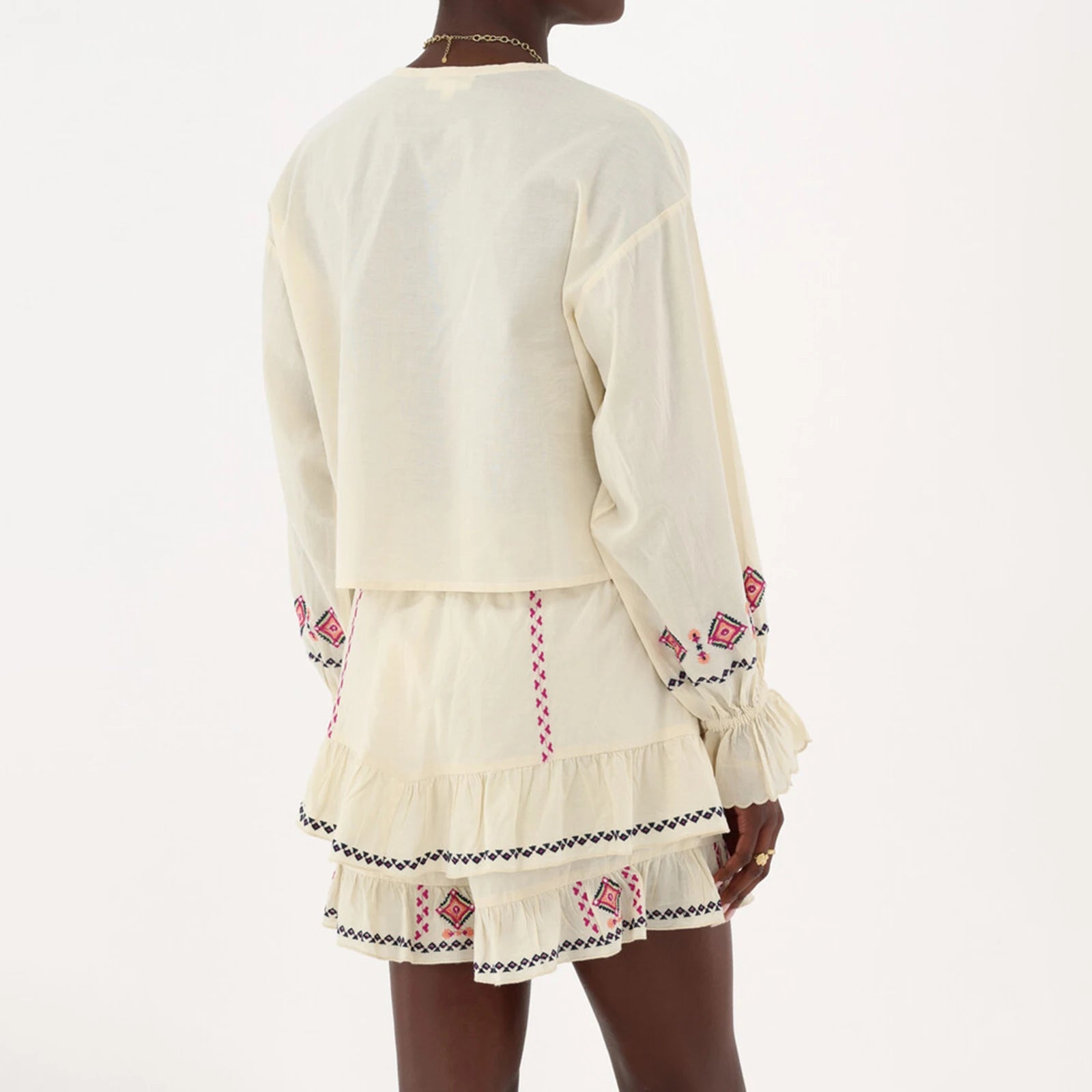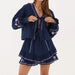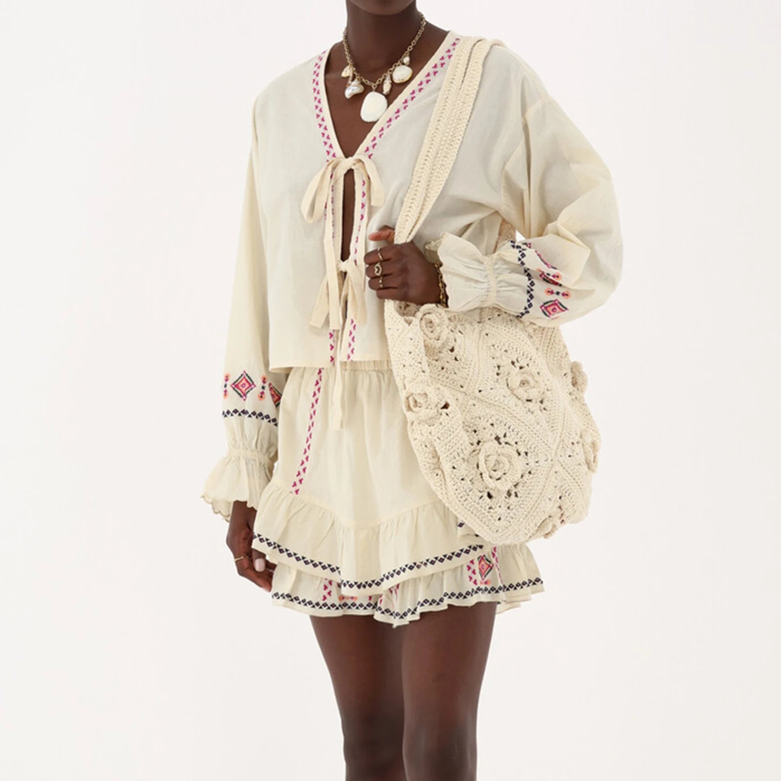 Long Sleeve Embroidered Tie Front Top And Mini Skirt Set