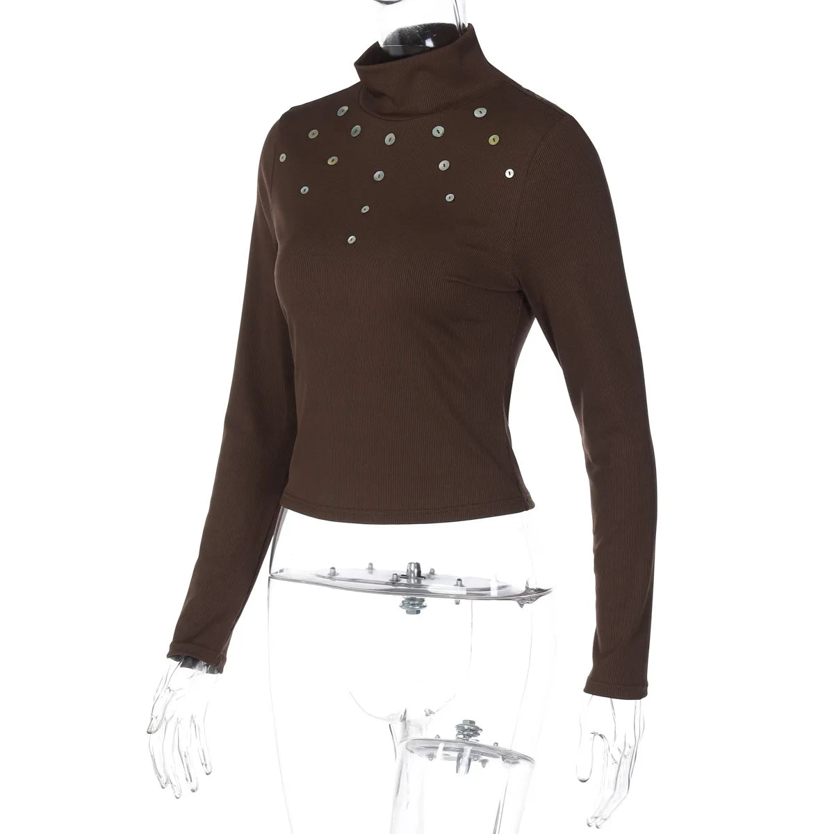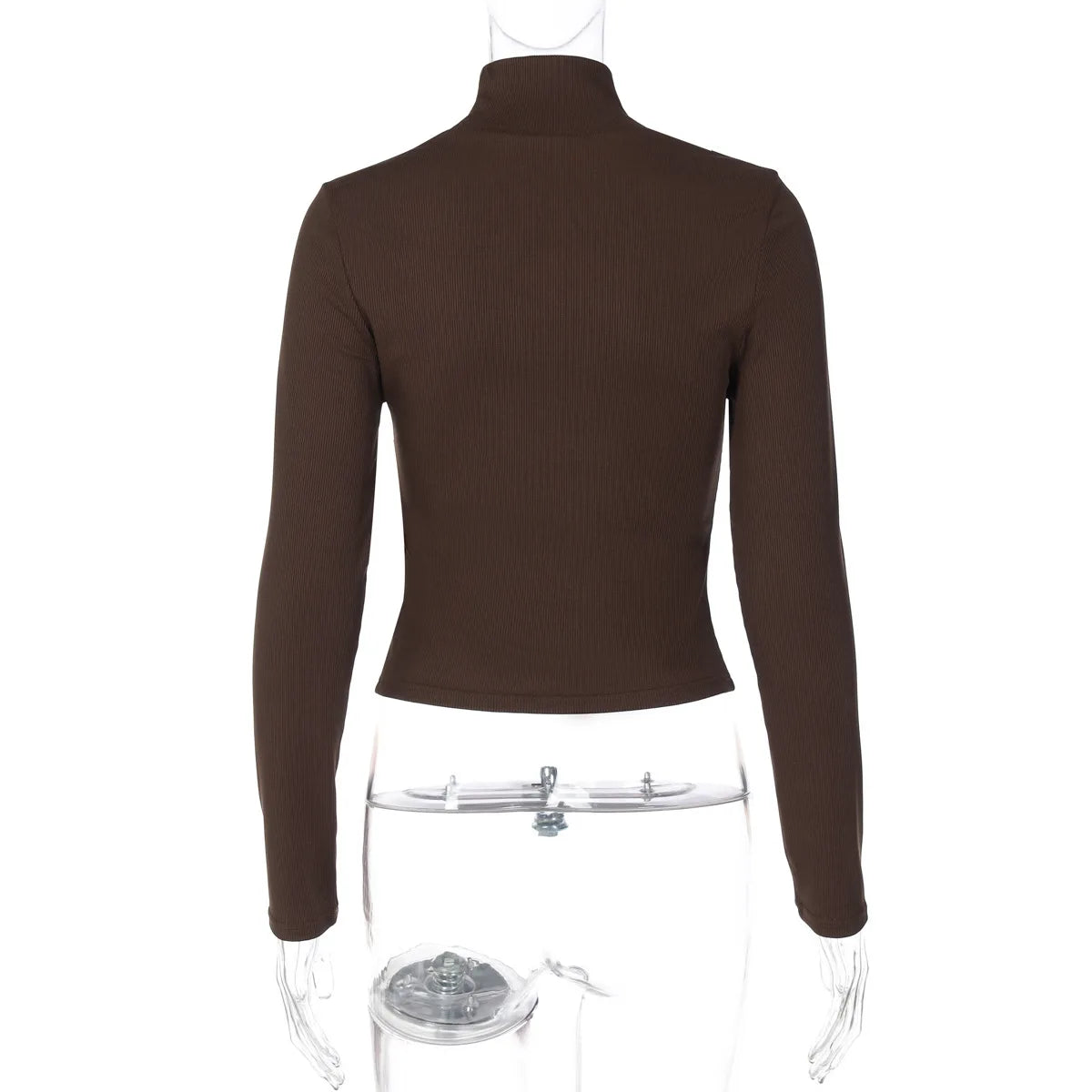 Person wearing a brown ribbed turtleneck and pants with button details, standing in front of a clothing rack.