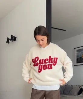 Person wearing a cream sweater with 'Lucky you' text in red on a plain background