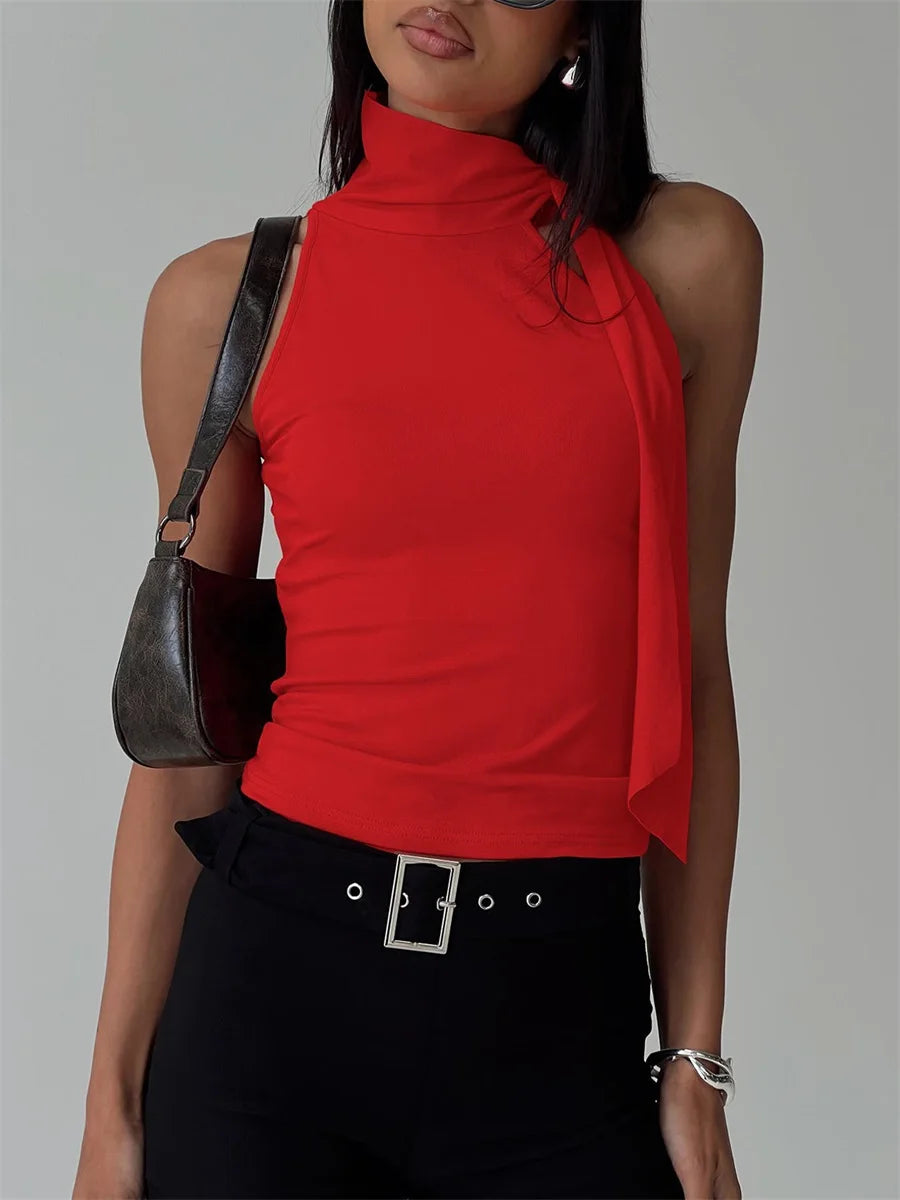 Elevate your warm-weather wardrobe with our Mock Neck Tie-Up Tank Top, a chic and versatile piece designed for effortless style. This contemporary top features a sophisticated mock neck and playful tie-up detailing, adding a unique touch to its classic silhouette. Crafted from a comfortable cotton-polyester blend with slight stretch, it offers a regular fit that's perfect for all-day wear. Ideal for Summer escapades, this solid tank top is a must-have for creating curated looks that transition seamlessly from day to night. Its clean lines and modern appeal make it an instant wardrobe refresh for the season.