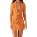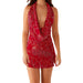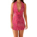 Woman wearing a pink floral dress in an outdoor setting with plants and white arches.