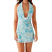 Woman wearing a light blue floral dress with a building and staircase in the background