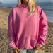 Person wearing a pink hoodie with a beach-themed design on a sandy background