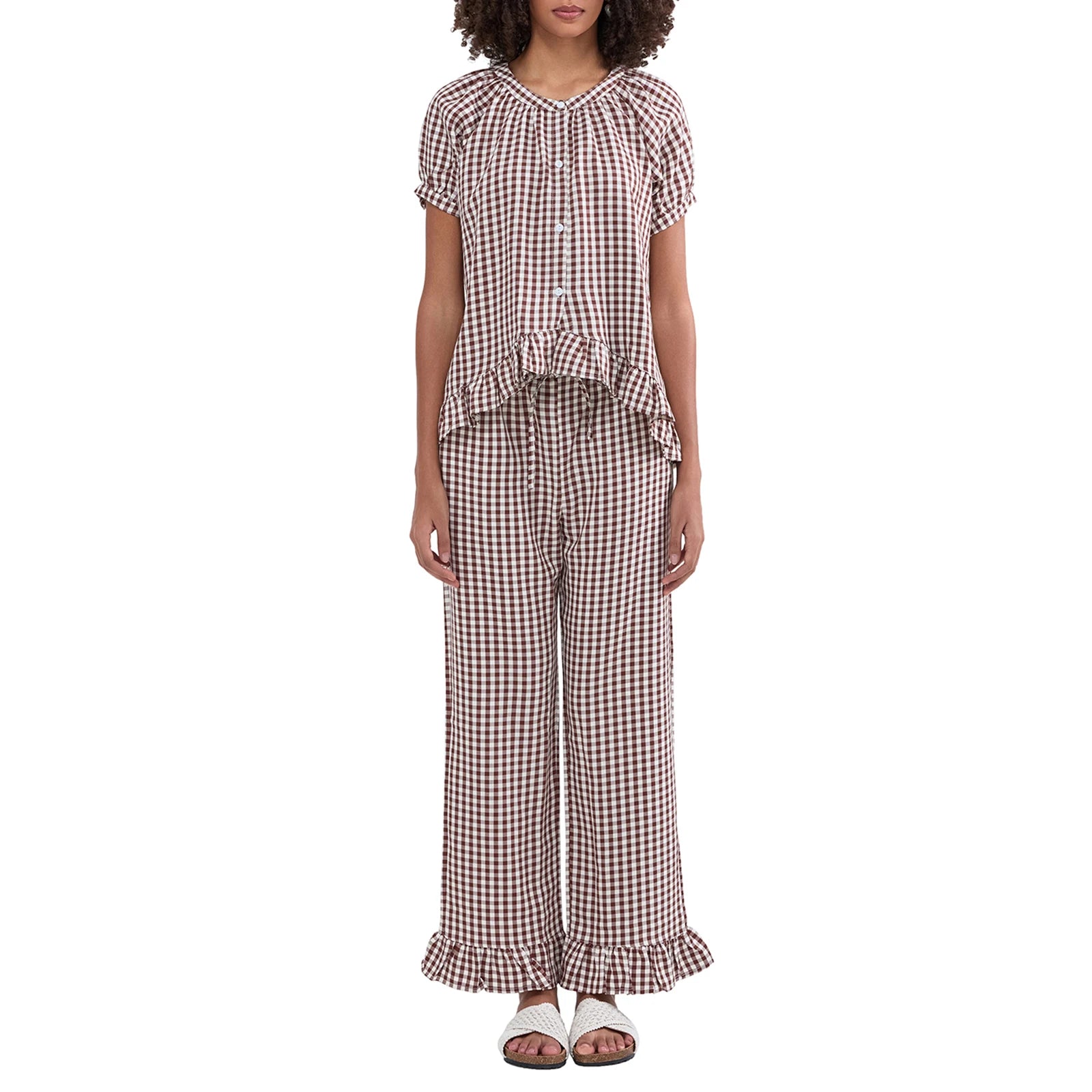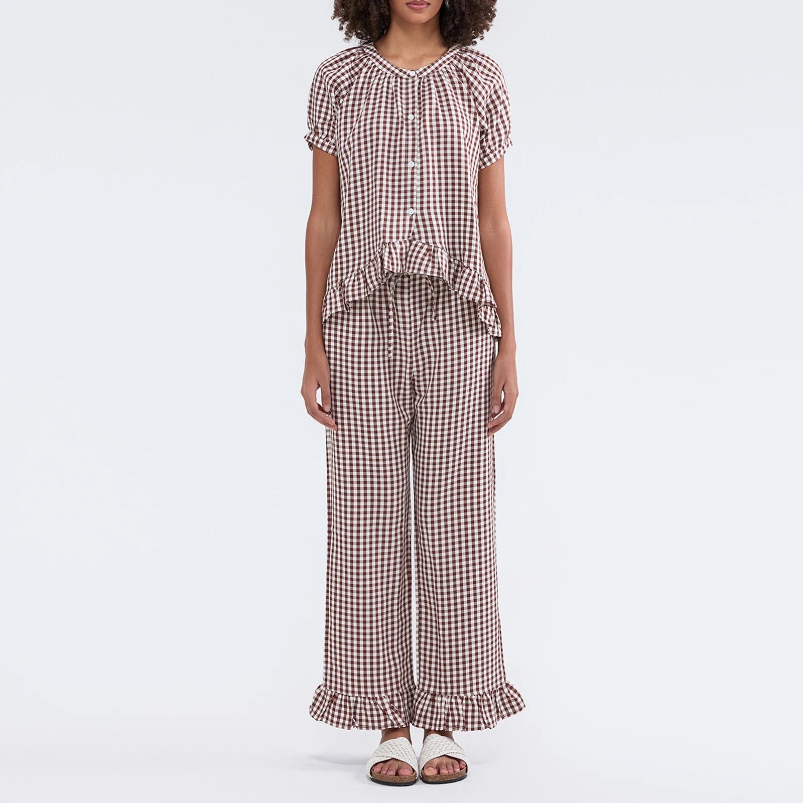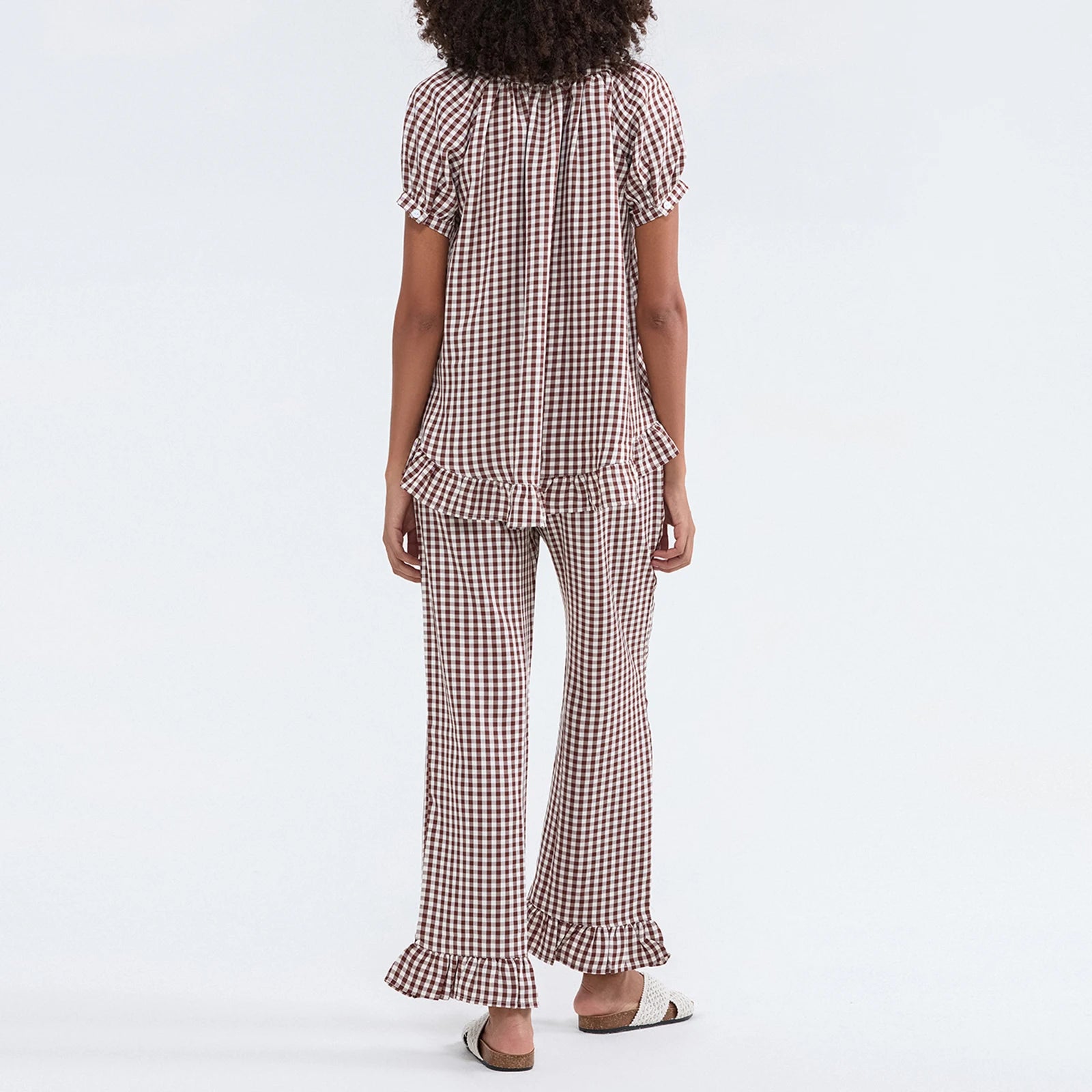 Woman wearing a blue checkered pajama set in a room with white walls.