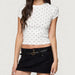 Woman wearing a pink polka dot crop top and black skirt on a light gray background